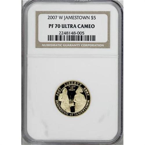 <B>2007-W $5 Jamestown PR70 Deep Cameo NGC.</B></I> NGC Census: (0/0). PCGS Population (242/0). Numismedia Wsl. Price for NGC/PCGS coin in PR70: $300. (#147442)<BR><BR><b>Shipping:</b> Coins & Currency (<a target="_blank" href="http://www.heritageauctions.com/common/shipping.php">view shipping information</a>)