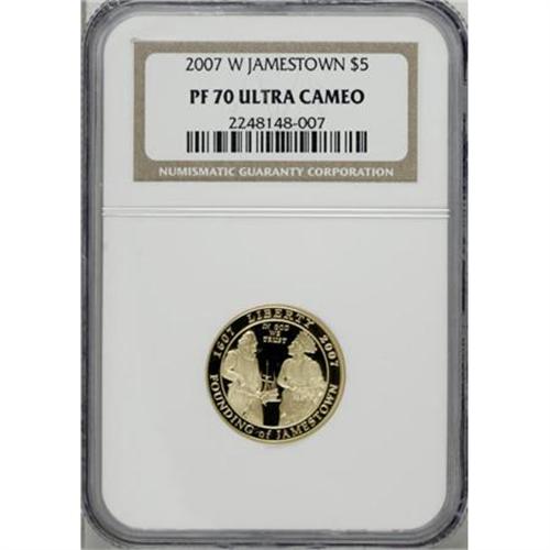 <B>2007-W $5 Jamestown PR70 Deep Cameo NGC.</B></I> NGC Census: (0/0). PCGS Population (242/0). Numismedia Wsl. Price for NGC/PCGS coin in PR70: $300. (#147442)<BR><BR><b>Shipping:</b> Coins & Currency (<a target="_blank" href="http://www.heritageauctions.com/common/shipping.php">view shipping information</a>)