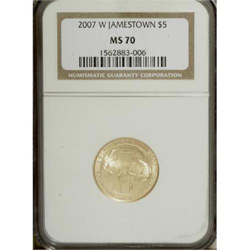 <B>2007-W $5 Jamestown MS70 NGC.</B></I> NGC Census: (0/0). PCGS Population (329/0). Numismedia Wsl. Price for NGC/PCGS coin in MS70: $325. (#147441)<BR><BR><b>Shipping:</b> Coins & Currency (<a target="_blank" href="http://www.heritageauctions.com/common/shipping.php">view shipping information</a>)