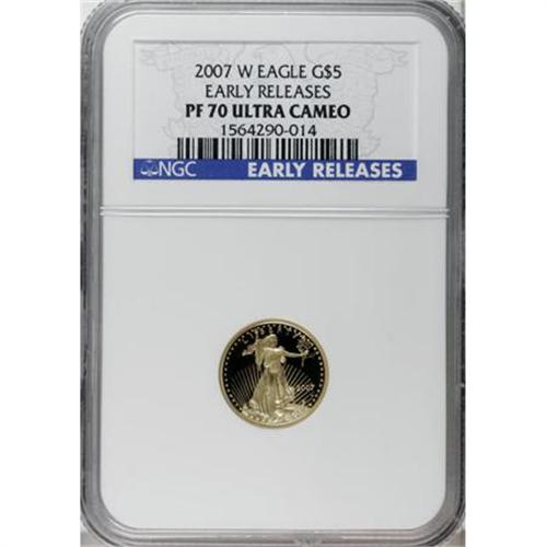 <B>2007-W $5 Tenth-Ounce American Gold Eagle PR70 Deep Cameo NGC.</B></I> Early Releases. NGC Census: (0/0). PCGS Population (107/0). (#148077)<BR><BR><b>Shipping:</b> Coins & Currency (<a target="_blank" href="http://www.heritageauctions.com/common/shipping.php">view shipping information</a>)