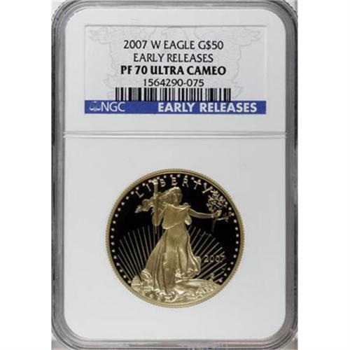 <B>2007-W $50 One-Ounce Gold Eagle PR70 Deep Cameo NGC.</B></I> Early Releases. NGC Census: (0/0). PCGS Population (91/0). (#148083)<BR><BR><b>Shipping:</b> Coins & Currency (<a target="_blank" href="http://www.heritageauctions.com/common/shipping.php">view shipping information</a>)