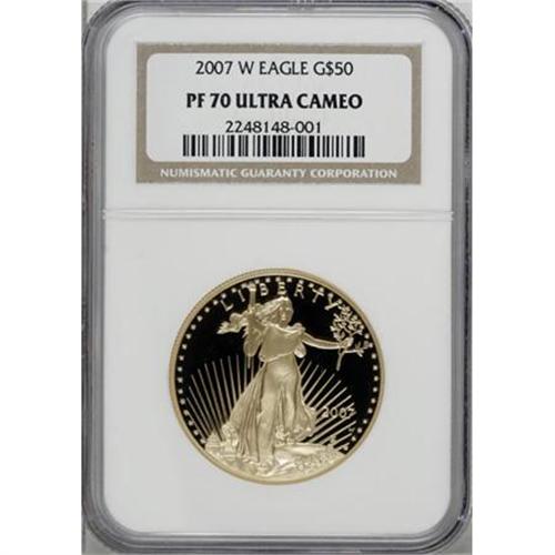 <B>2007-W $50 One-Ounce American Gold Eagle PR70 Deep Cameo NGC.</B></I> NGC Census: (0/0). PCGS Population (91/0). (#148083)<BR><BR><b>Shipping:</b> Coins & Currency (<a target="_blank" href="http://www.heritageauctions.com/common/shipping.php">view shipping information</a>)