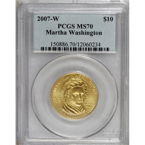 <B>2007-W G$10 Martha Washington MS70 PCGS.</B></I> Martha Washington was a wealthy widow when she married her second husband, George Washington, in 1759. This shining half-ounce gold piece celebrating her is absolutely perfect, decisively struck with excellent luster.<BR><BR><b>Shipping:</b> Coins & Currency (<a target="_blank" href="http://www.heritageauctions.com/common/shipping.php">view shipping information</a>)