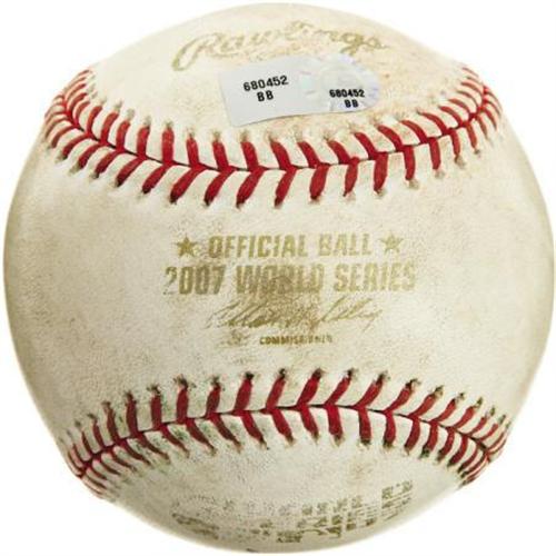 <B>2007 World Series Game One Dustin Pedroia Home Run Baseball.</B></I> The defining moment of Pedroia's 2007 American League Rookie of the Year season came just two pitches into that year's Fall Classic, as he took Colorado Rockies ace Jeff Francis deep over Fenway Park's fabled Green Monster, only the second time in history that the first batter in a World Series has homered. Presented here is that very baseball that set the dominant tone for the 2007 Series, which the Sox led for all but four of the thirty-six innings it took to secure its second World Championship in four seasons. The Official World Series baseball is nicely rubbed up for its brief, dramatic service to Red Sox history, with the golden stamping seeming particularly appropriate in this context. Pedroia's 10/10 black felt tip signature adorns the sweet spot, and his notation "Laser show," a reference to an earlier boast about his slugging abilities that made the newspaper rounds, stretching across the eastern side panel. The airtight provenance comes in the form of an Official Major League Baseball holographic authenticating sticker with the serial number "BB 680452." This number can be referenced at the www.MLB.com website by choosing "MLB Authentication" from the drop-down menu entitled "Auction" at the top banner of the homepage. As fitting a symbol as any for the Sox' transformation from heartbreak kids to heavyweight champs, this baseball will surely cause quite a stir among the Fenway faithful. We'll see who's the biggest Red Sox fan of all when the hammer falls on this lot. <I>MLB Authentication sticker. LOA from PSA/DNA (autograph). LOA from James Spence Authentication (autograph).</B></I><BR><BR><b>Shipping:</b> Balls, Pucks, etc., Small (<a target="_blank" href="http://www.heritageauctions.com/common/shipping.php">view shipping information</a>)