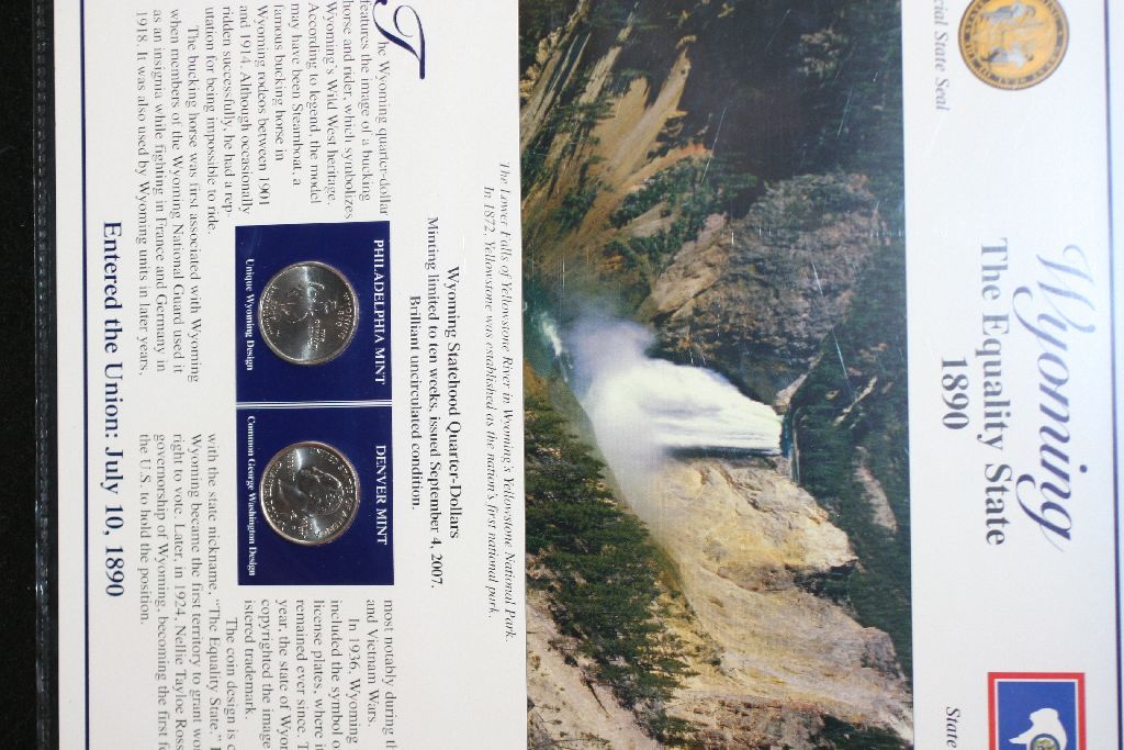 2007 Wyoming State Quarter Set W/Postal Stamps Commerating 50th Anniversary Ending Woman Suffrage & Centennial Wyoming Statehood; P&D Mints