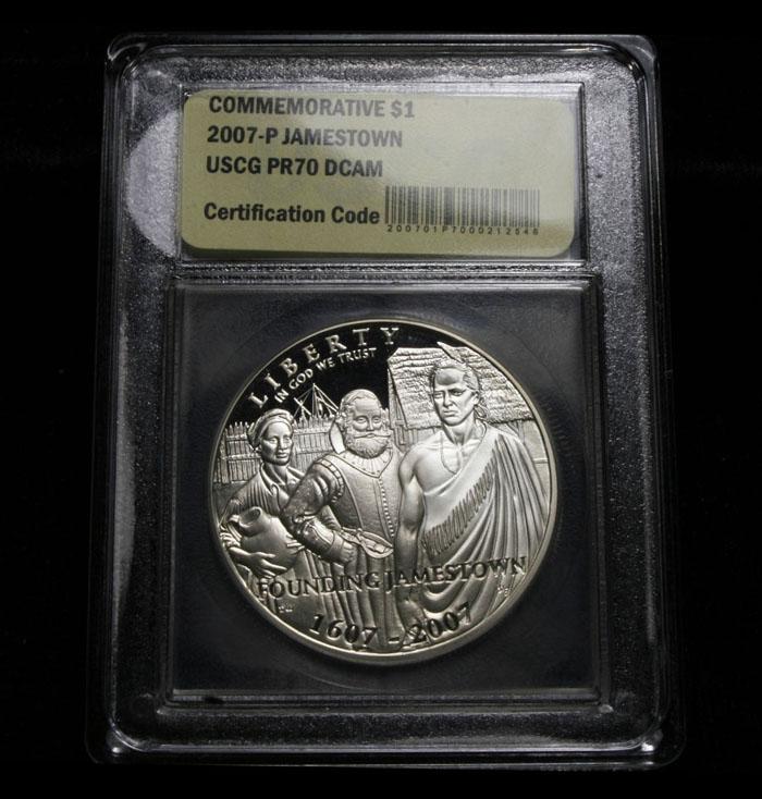 the 2007 Jamestown Silver Dollar was issued to mark the 400th anniversary of the settlement at Jamestown, Virginia. Three ships, the Susan Constant, Godspeed, and Discovery carried 105 settlers to the New World to establish the first permanent English settlement in what would become America. PCGS lists the PR70 DCAM at $410. This example is graded PR70 DCAM by USCG. Estimated Value $125