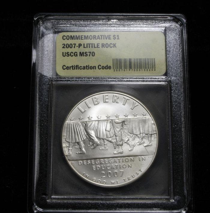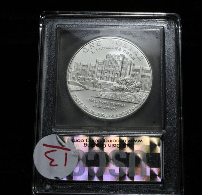 The reverse of this commemorative features the Little Rock Central High School as it appeared in 1957. PCGS lists the ms70 at $350. This example has been encapsulated and Graded ms70 by USCG. Estimated Value $125