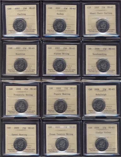 2007 to 2009 25¢ ICCS MS65, Lot of 12 coins all from the Olympic series, a nice complete set.