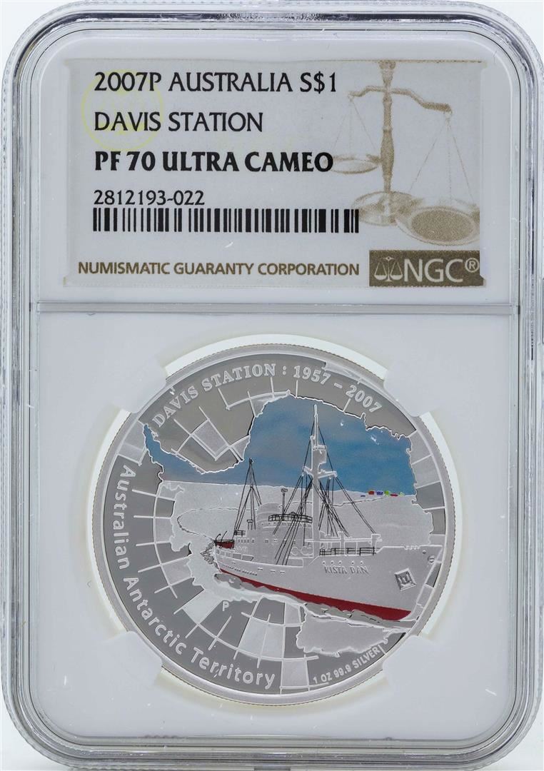 One 2007P $1 Australia Davis Station Proof Silver Coin NGC PF70 Ultra Cameo. NGC Certified.