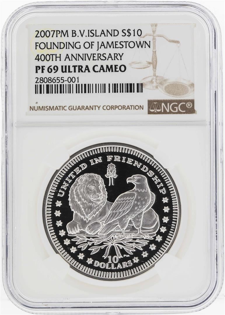 One 2007PM $10 B.V. Island Jamestown 400th Anniversary Silver Coin NGC PF69 Ultra Cameo. NGC Certified.