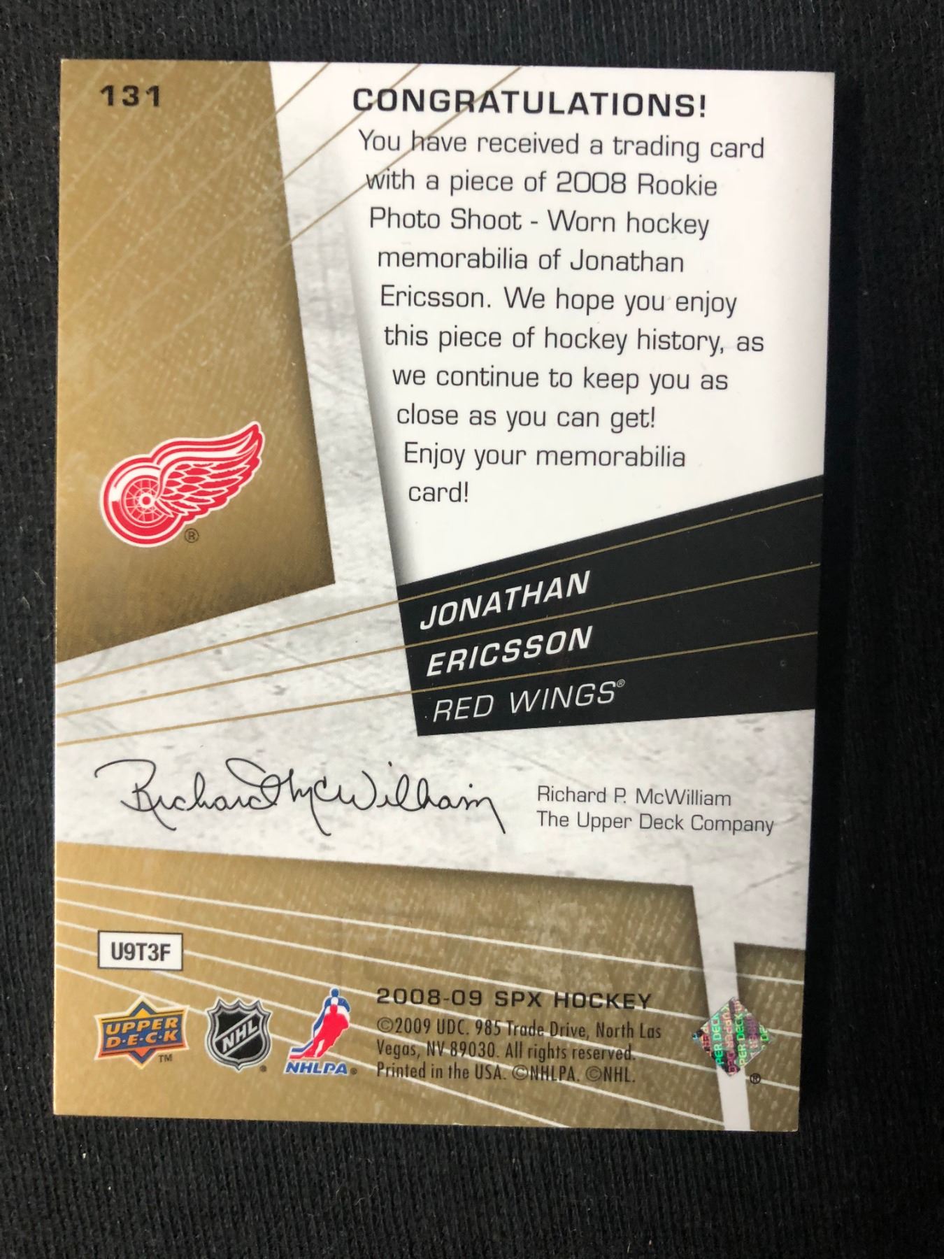 2008-09 SPx #131 Jonathan Ericsson Red Wings Rookie Jersey