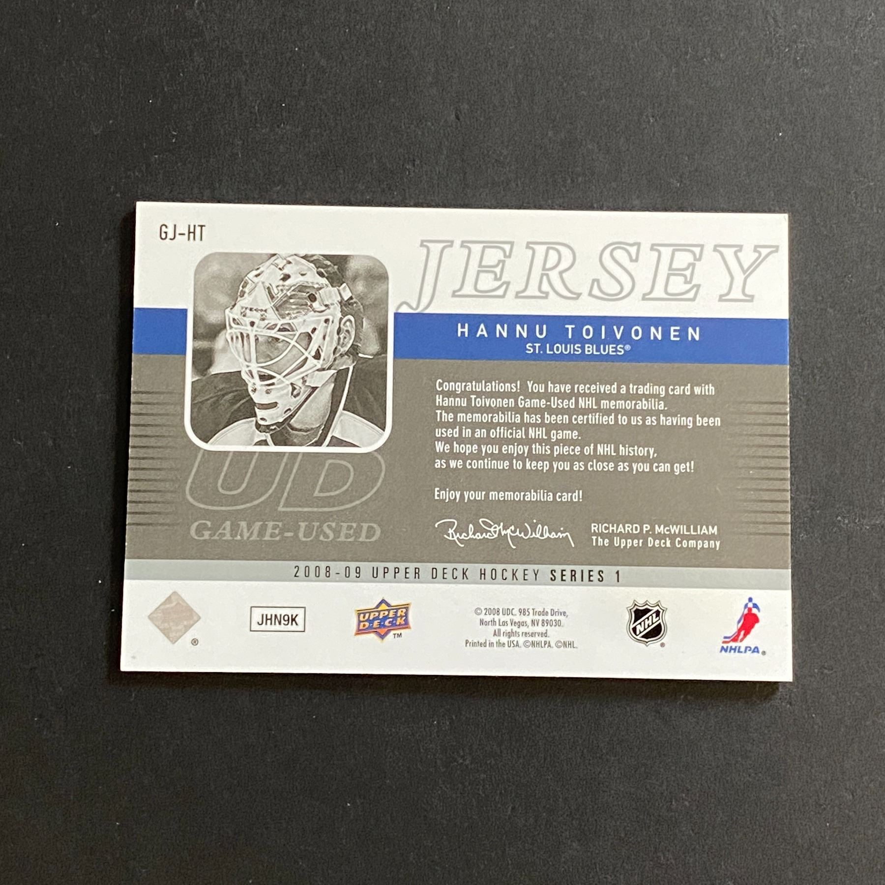 2008-09 U.D SERIES 1 HOCKEY HANNU TOIVONEN JERSEY CARD