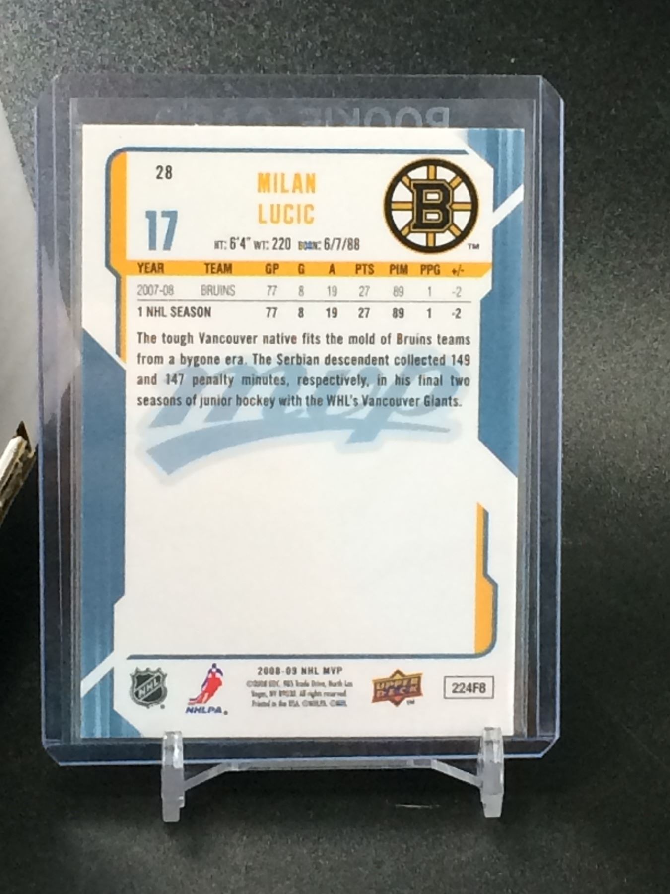 2008-09 UPPER DECK MVP NO.28 MILAN LUCIC ROOKIE AUTO