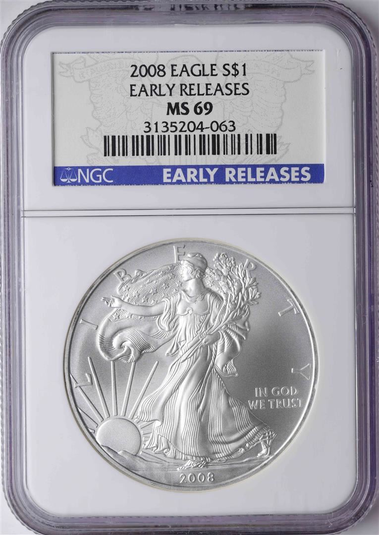 One 2008 $1 American Silver Eagle Coin NGC MS69 Early Releases. NGC Certified.