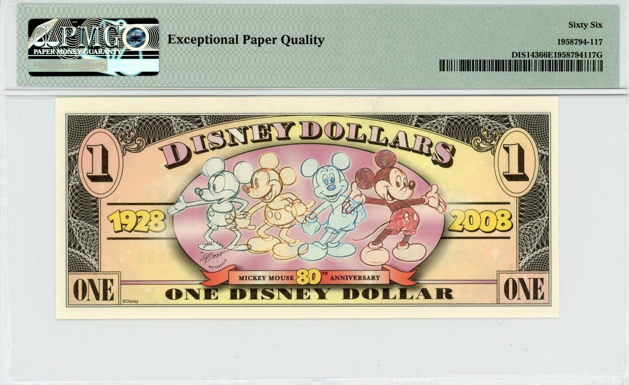 One 2008 $1 Mickey Disney Dollar PMG 66EPQ.
