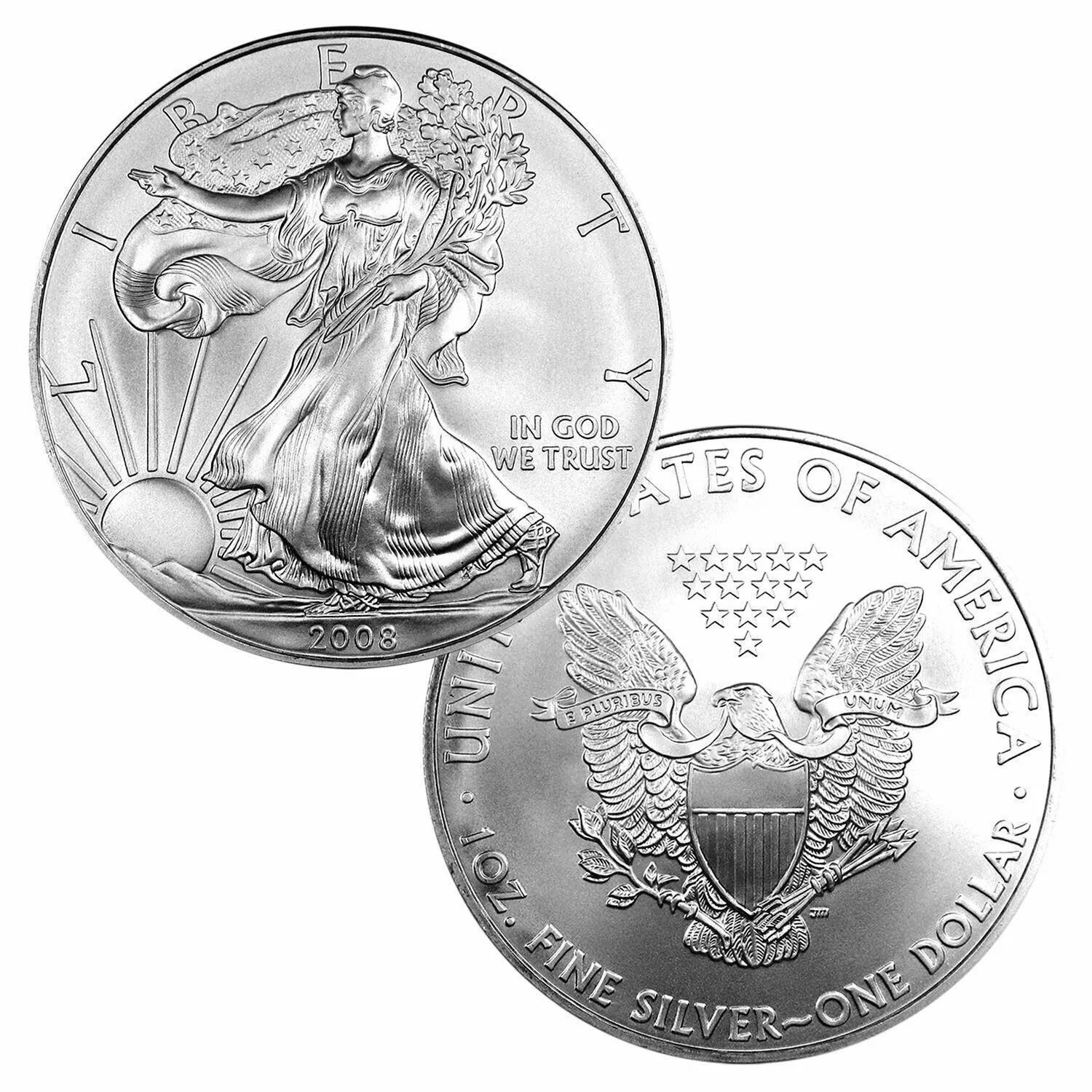 2008 $1 US American Silver Eagle UNC One Ounce FINE Silver Round Coin Dollar BU - The¾American Silver Eagle¾is the official¾silver¾bullion coin¾of the¾United States. It was first released by the¾United States Mint¾on November 24, 1986. It is struck only in the one-troy ounce¾size, which has a¾nominal¾face value¾of one¾dollar¾and is guaranteed to contain one troy ounce of 99.9% pure¾silver. It is authorized by¾Title II of Public Law 99-61 (Liberty Coin Act, approved July 9, 1985)¾and¾codified¾as¾31 U.S.C.¾_¾5112(e)-(h). Its content, weight, and purity are certified by the United States Mint. In addition to the bullion version, the United States Mint has produced a¾proof¾version and an¾uncirculated¾version for¾coin collectors. The Silver Eagle has been produced at three mints: the¾Philadelphia Mint, the¾San Francisco Mint, and the¾West Point Mint. The American Silver Eagle bullion coin may be used to fund¾Individual Retirement Account¾investments