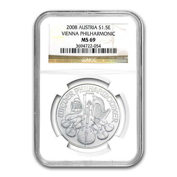 2008 1 oz Silver Austrian Philharmonic MS-69 NGC **|**|** 2008 1 oz Silver Austrian Philharmonic MS-69 NGC ; MSRP: $100