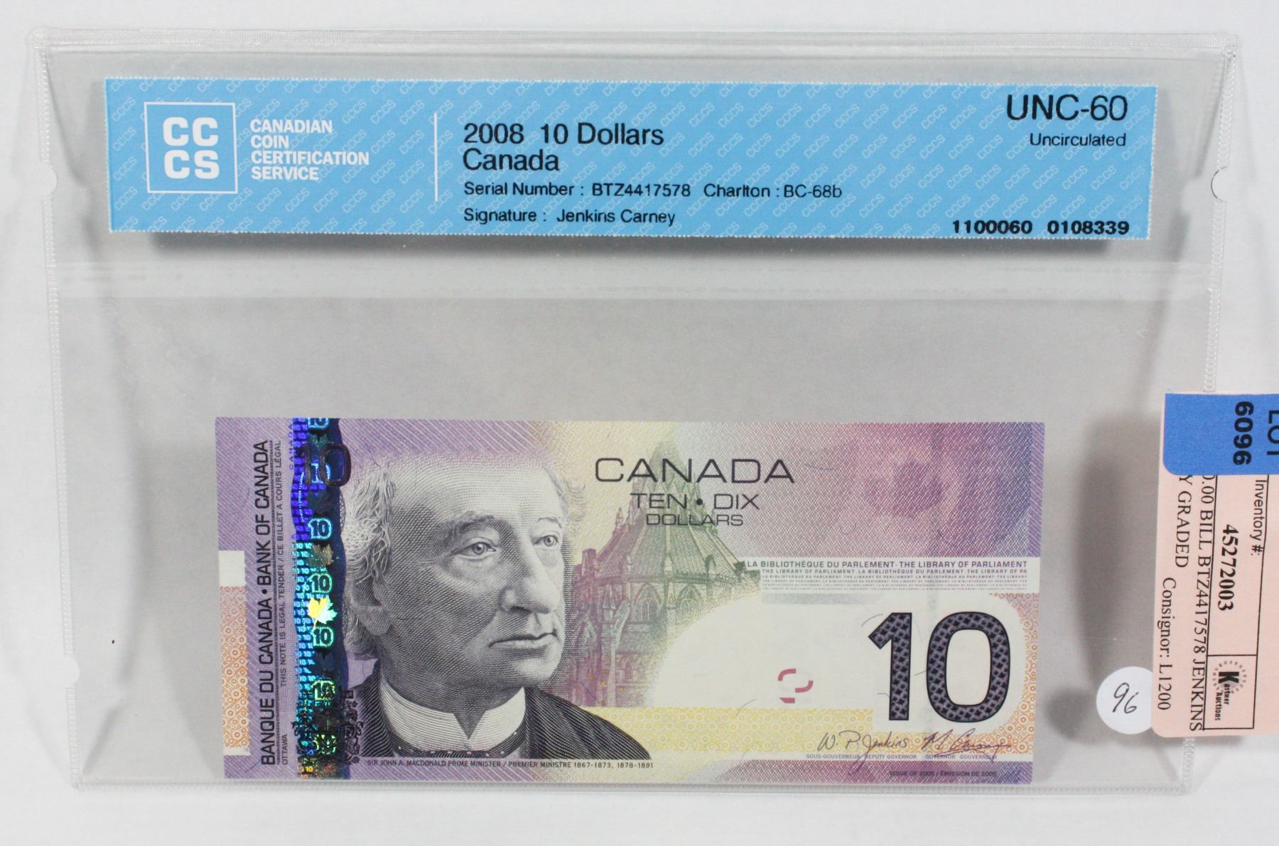 BY C.C.C.S. UNCIRCULATED 60. 2008 $10.00 bill look very closely at bill all perfect including the security tab bill in, grade is off.
