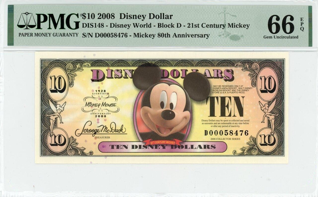 One 2008 $10 Mickey 80th Anniversary Disney Dollar PMG 66EPQ.