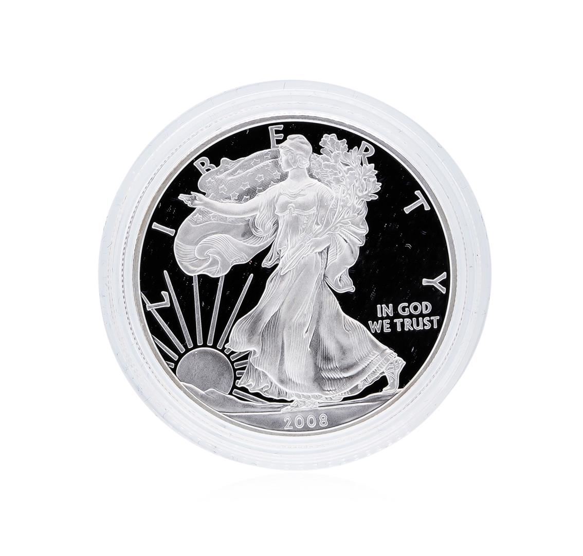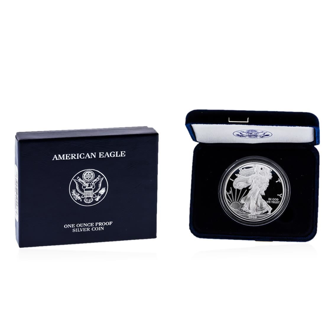 One 2008 1oz American Silver Eagle Proof Coin with Box and Certificate of Authenticity. This Silver American Eagle coin's limited mintage makes it a popular choice for any collector.