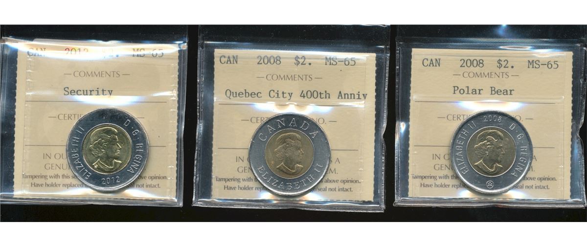 2008 $2 Bear, Quebec City & 2012 Security ICCS MS65. Lot of 3 coins.