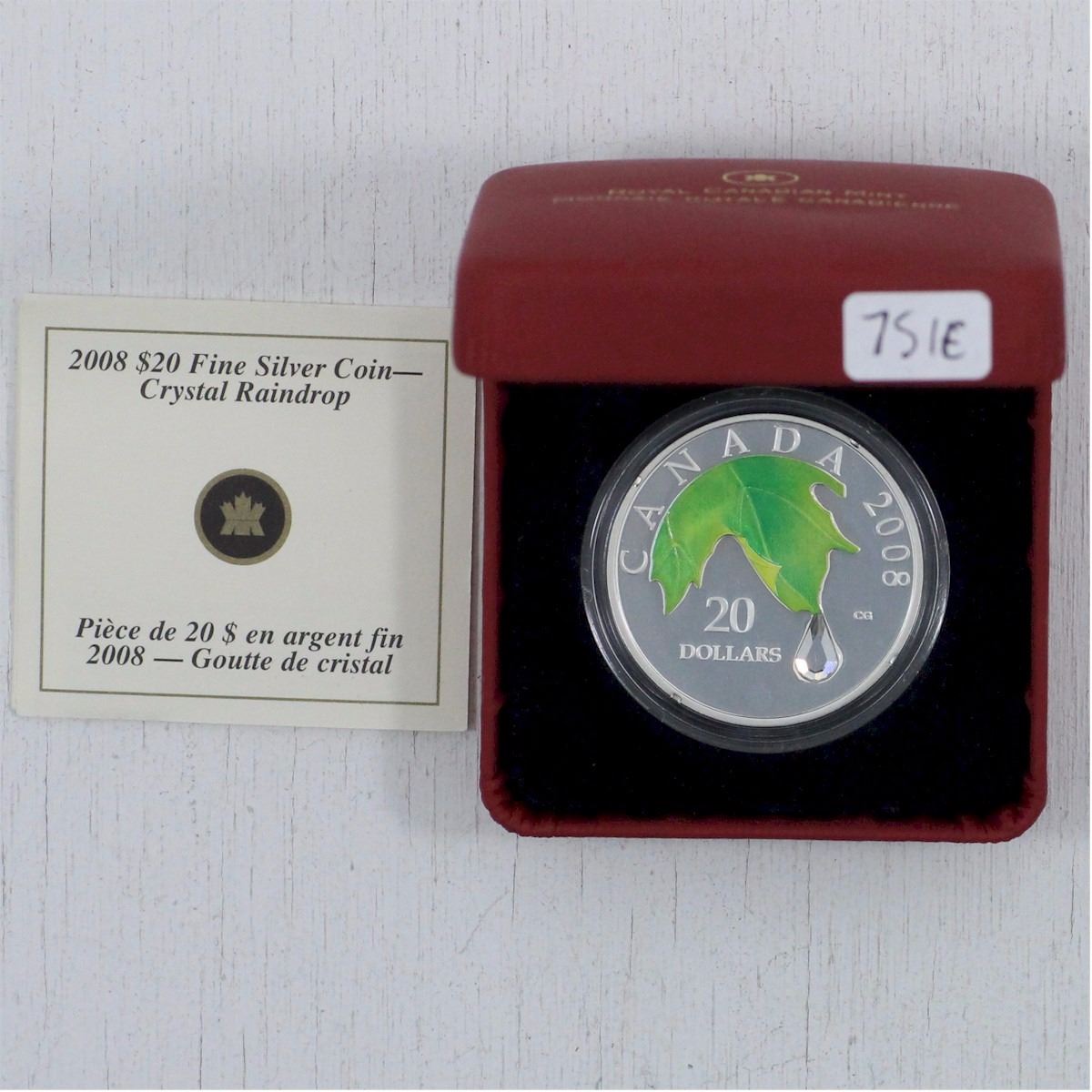 2008 $20 Crystal Raindrop Silver Coin. Please Note the outer cardboard sleeve is missing and the coin has a light toning. (Tax Exempt). Buyers Premium will be added on all items as per our terms of sale. We accept Paypal, Credit Card, E-Transfer Payments, Cheque or Money Orders (there is an additional 3% fee for using Paypal or Credit Card). All invoices will be emailed immediately following the auction, please contact us if you would like to pay by credit card or receive a new revised lower total for mailing in payment or sending an e-transfer (3% discount). All Items Are Sold "AS IS", no returns