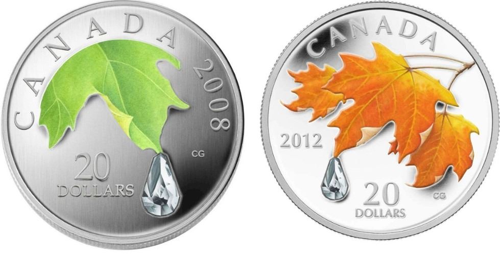 2008 $20 Fine Silver Coin Crystal Raindrop, and 2012 Maple Leaf with Crystal Raindrop.