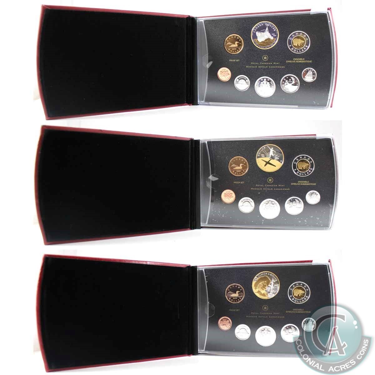 2008, 2009 & 2010 Gold Plated Proof Double Dollar Sets in original Red Display Only. Coins are lightly toned and the leatherette display is tattered. 3 Sets