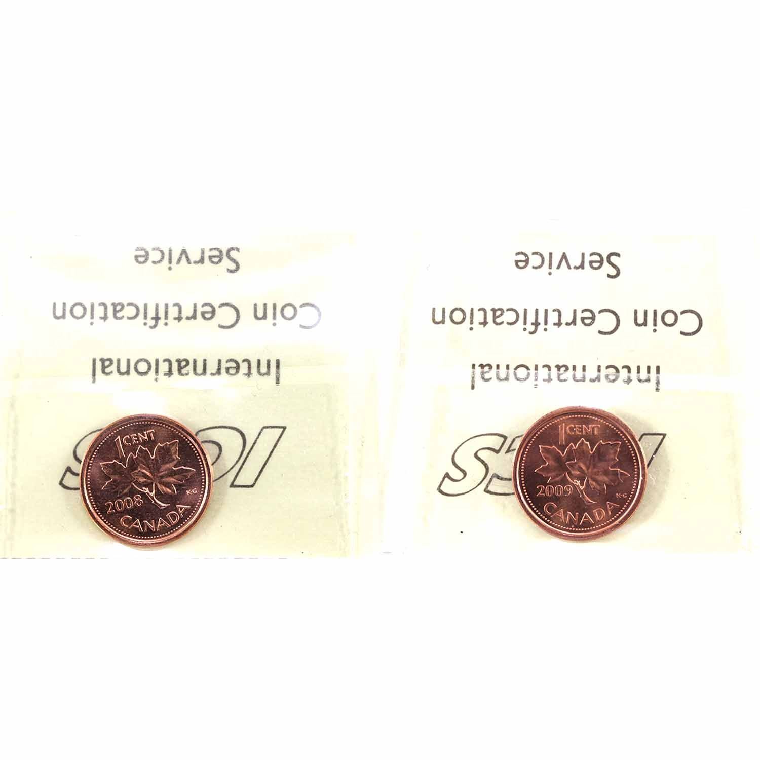 2008 & 2009 Both Magnetic Canada 1-cent ICCS Certified MS-67, Red. 2pcs.