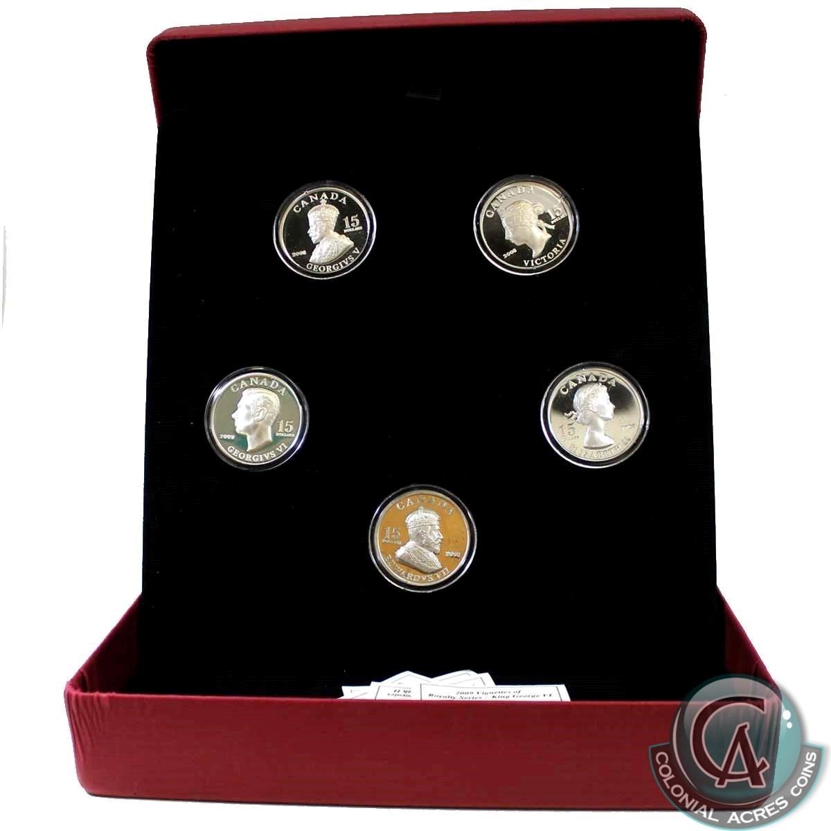 2008-2009 Vignettes of Royalty Series $15 Sterling Silver 5-Coin Set from the RCM. Set is missing the outer sleeve, the coins are lightly toned and outer case is lightly scuffed.
