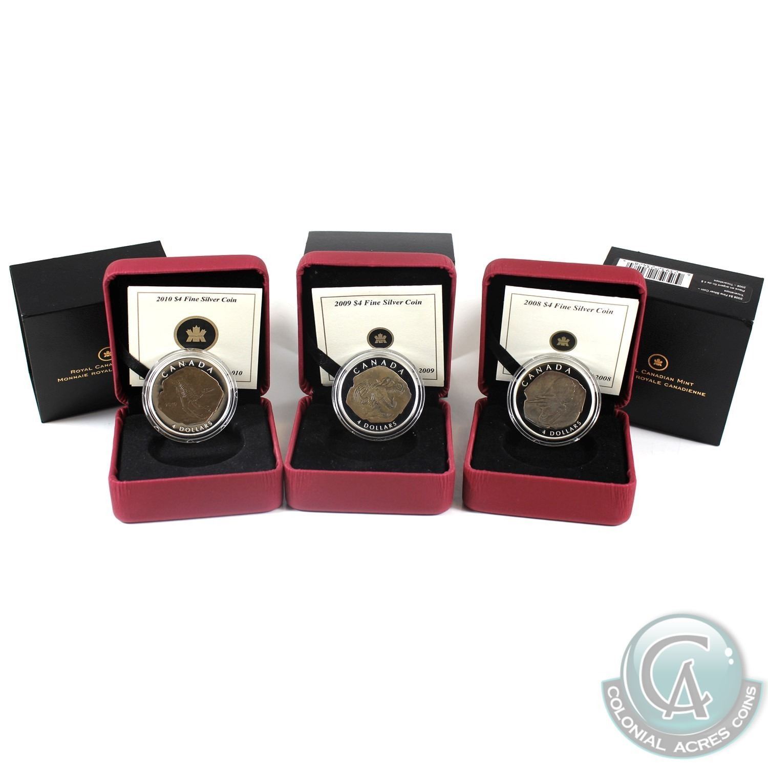 2008-2010 Canada $4 Dinosaur Collection - 2008 Triceratops, 2009 Tyrannosaurus Rex & 2010 Dromaeosaurs Fine Silver Coins. 3pcs (TAX Exempt)