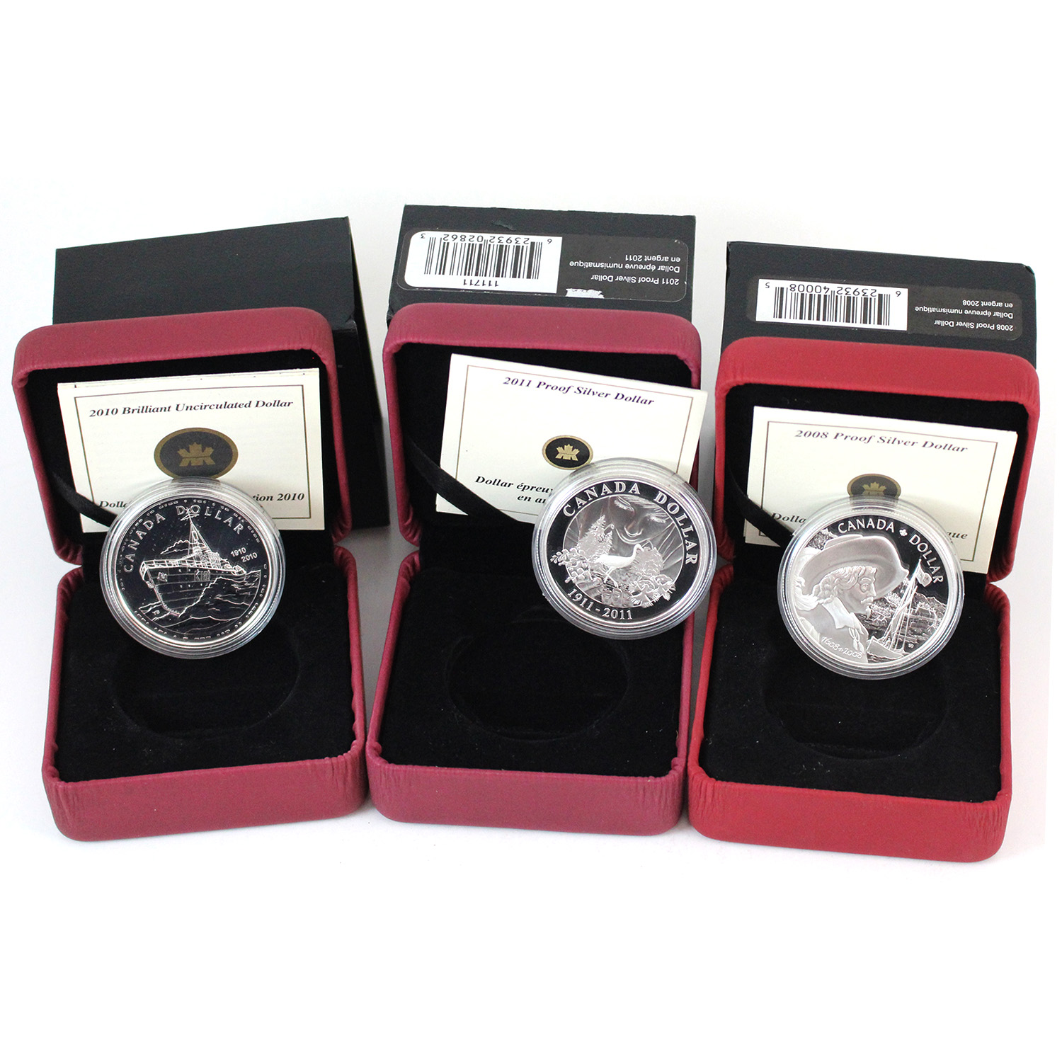 2008 $1 400th Anniv. of Quebec City, 2010 Canadian Navy Centennial & 2011 Parks Canada 100th Anniv. (1911-2011) Proof Silver Dollars. Wear/dents/marks to outer sleeves, scratched capsules. 3pcs.