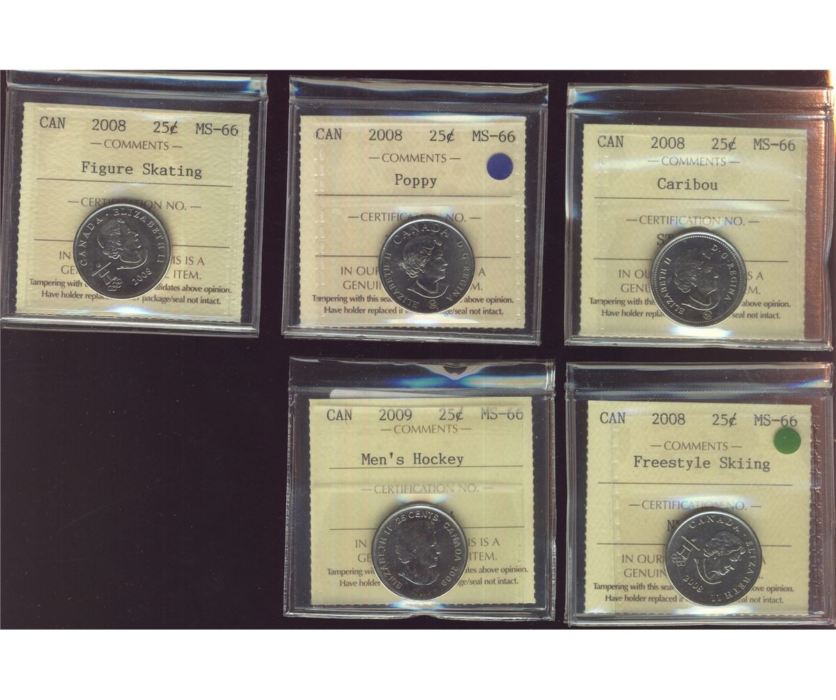 2008 25¢ Caribou, Poppy, Figure Skating, Freestyle Skiing & 2009 Men's Hockey all ICCS MS66. Lot of 5 coins.