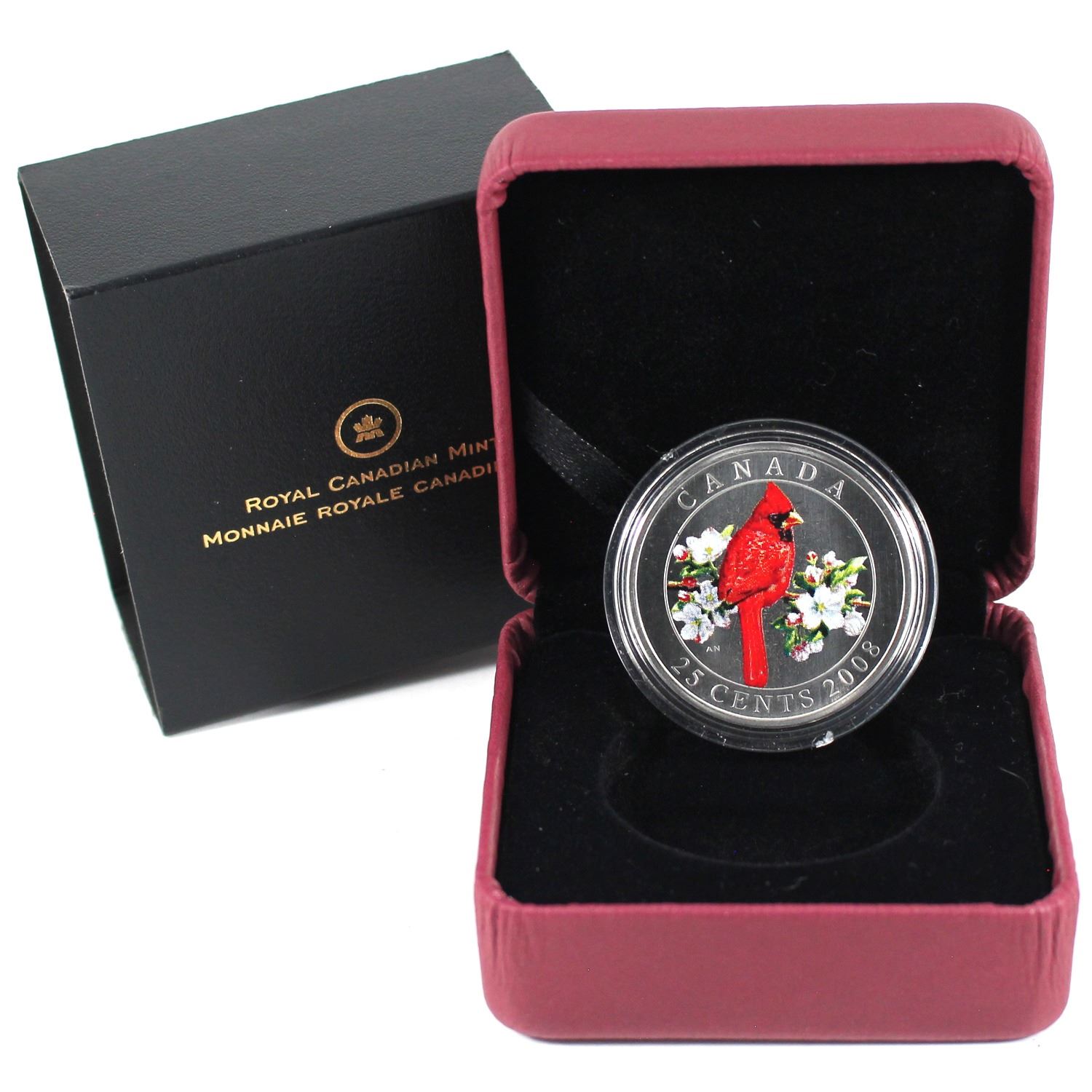 2008 25-cent Birds of Canada - Northern Cardinal. Includes outer cardboard sleeve, red clamshell, and coin. Incorrect label on outer sleeve.