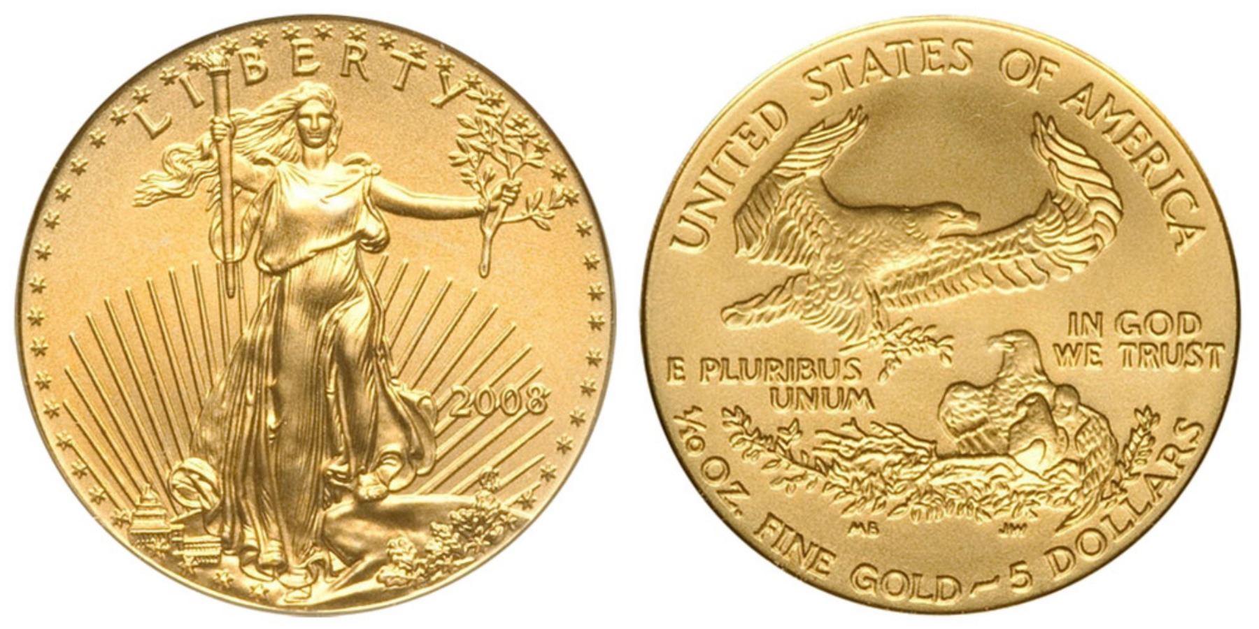 One 2008 $5 American Gold Eagle Coin.