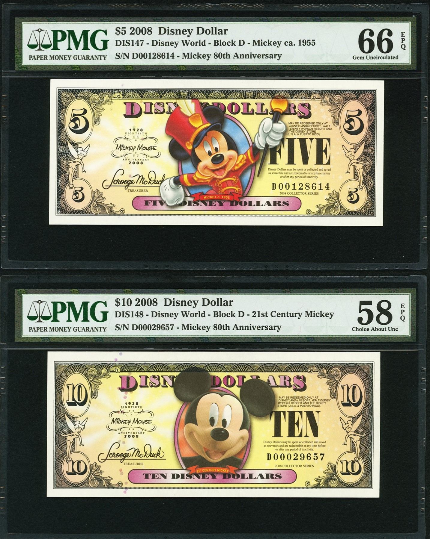 2008 $5 and $10 Mickey's 80th Anniversary Dollars PMG 66EPQ and 58EPQ.