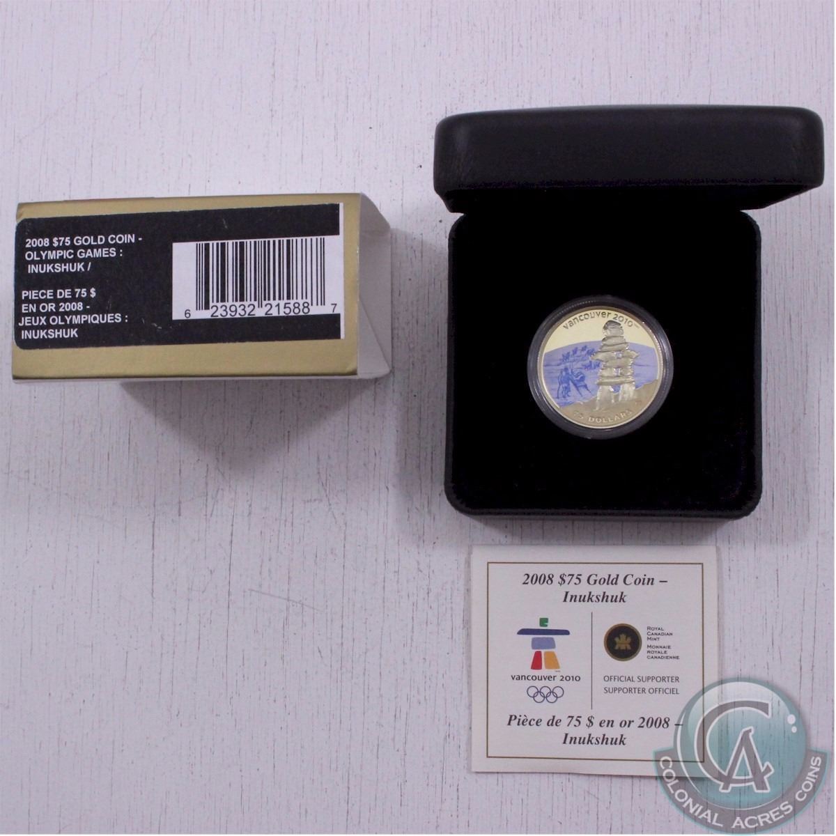2008 $75 14 Karat Inuksuk Fine Gold Coin (contains 0.225 oz. of pure gold). This coin commemorates the 2010 Vancouver Olympic Games. Coin comes with all original packaging from the Royal Canadian Mint.
