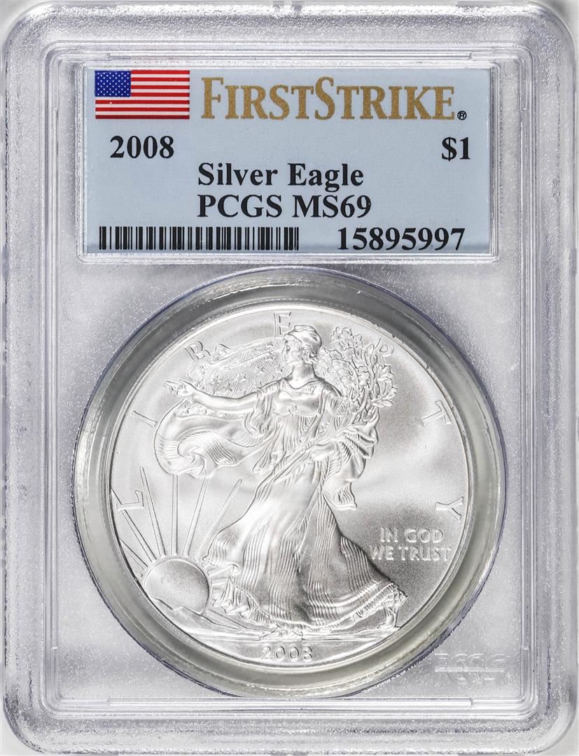 One 2008 American Silver Eagle Coin PCGS MS69 First Strike. PCGS Graded.
