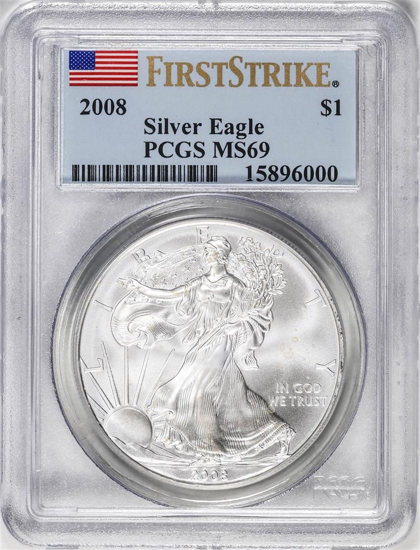 One 2008 American Silver Eagle Coin PCGS MS69 First Strike. PCGS Graded.
