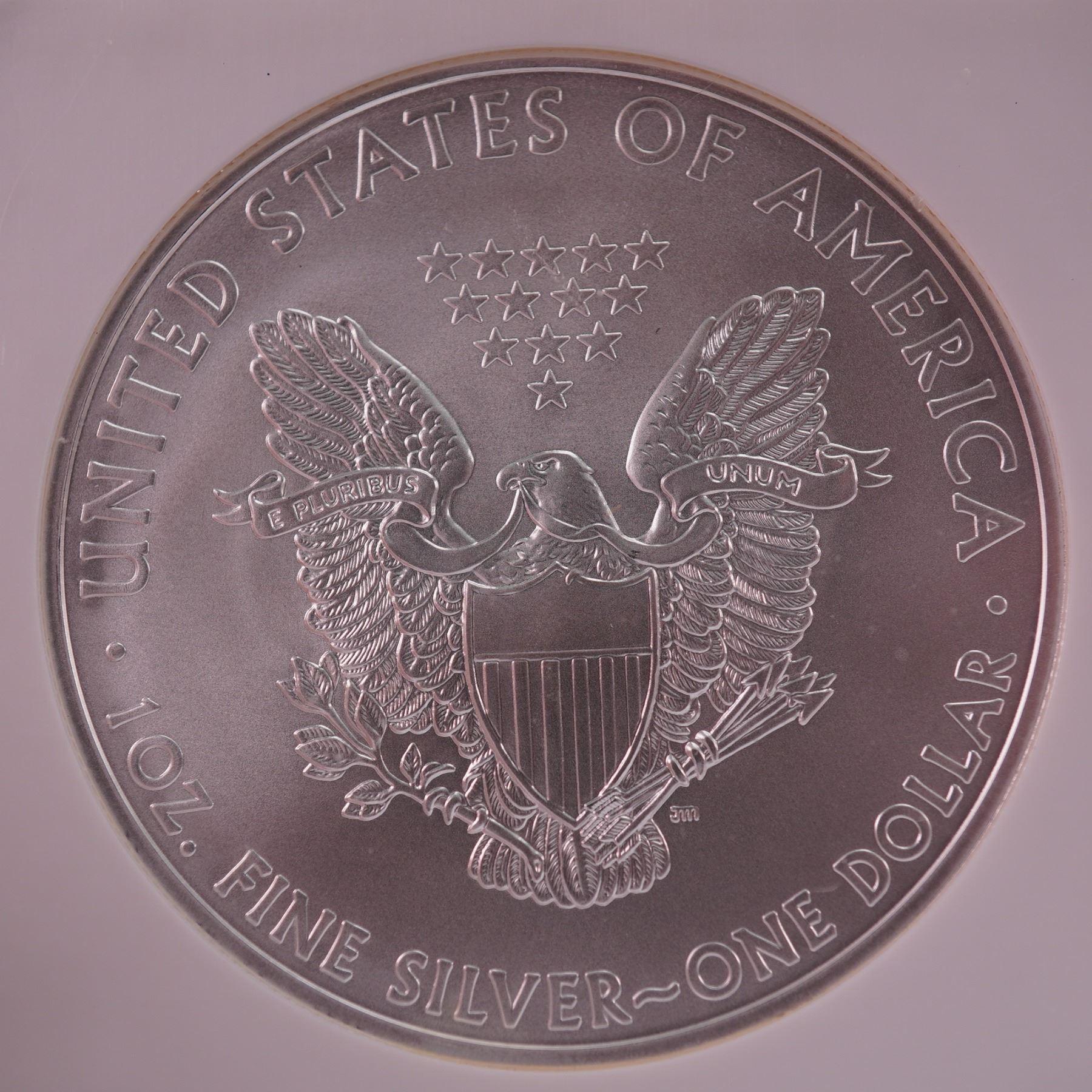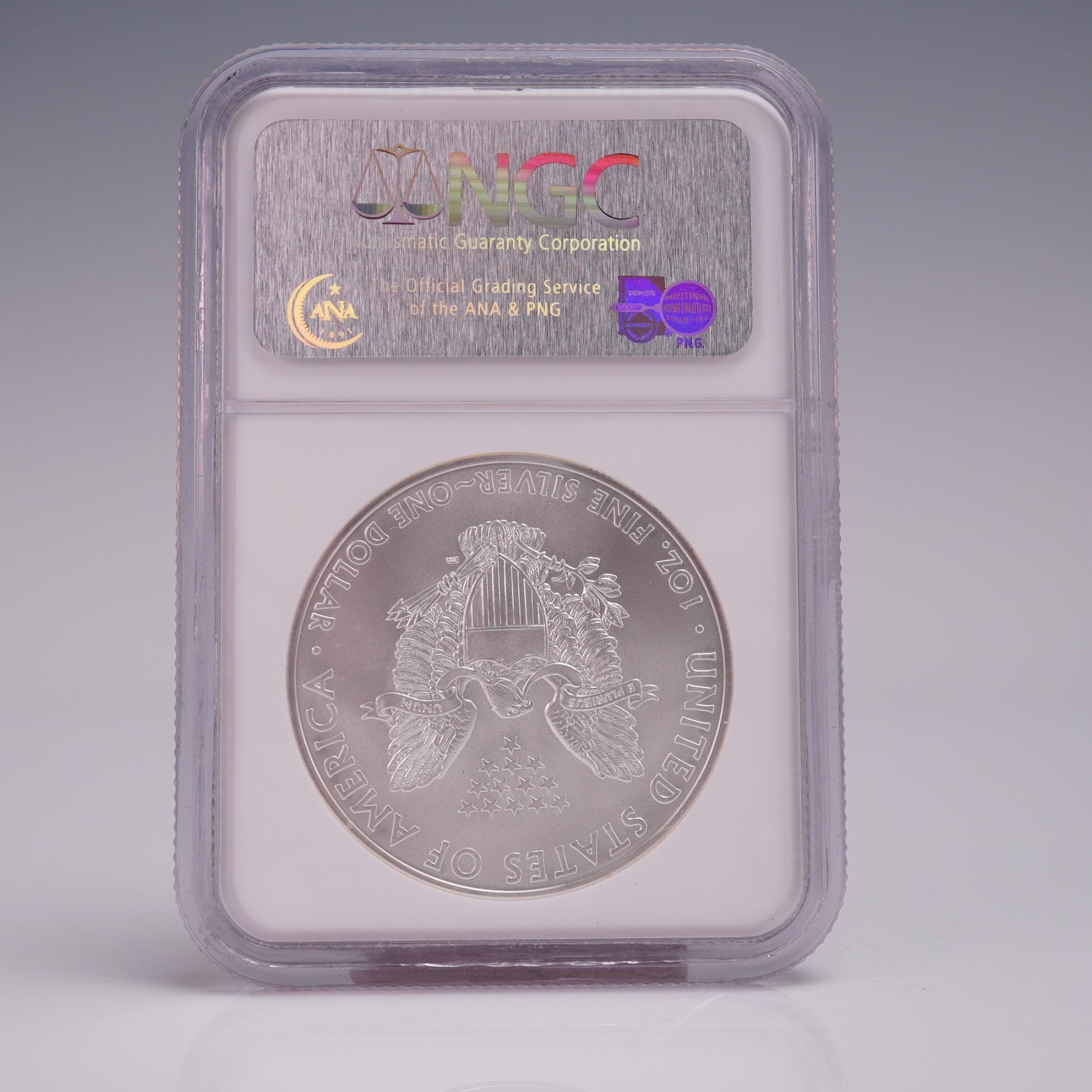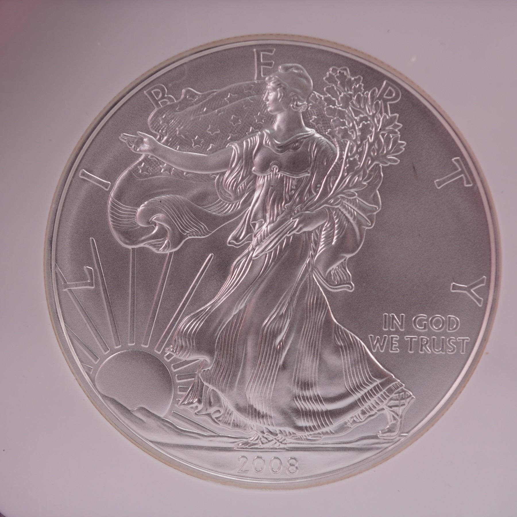 A 2008 American Silver Eagle containing one troy ounce of fine silver, encapsulated and graded MS69 by NGC with the "Early Releases" designation. The obverse displays the timeless Walking Liberty motif by Adolph A. Weinman, portraying Liberty striding toward a radiant sunrise while enveloped in the national flag and bearing branches of oak and laurel. On the reverse, John Mercanti's heraldic eagle design reinforces the coin's official character, with a shielded eagle clutching both arrows and an olive branch beneath a cluster of thirteen stars. Encapsulated in a tamper evident holder for further preservation and authentication. Slab measures: 2.25"L x 0.25"W x 3.25"H. Coin diameter: 40.6 mm.
