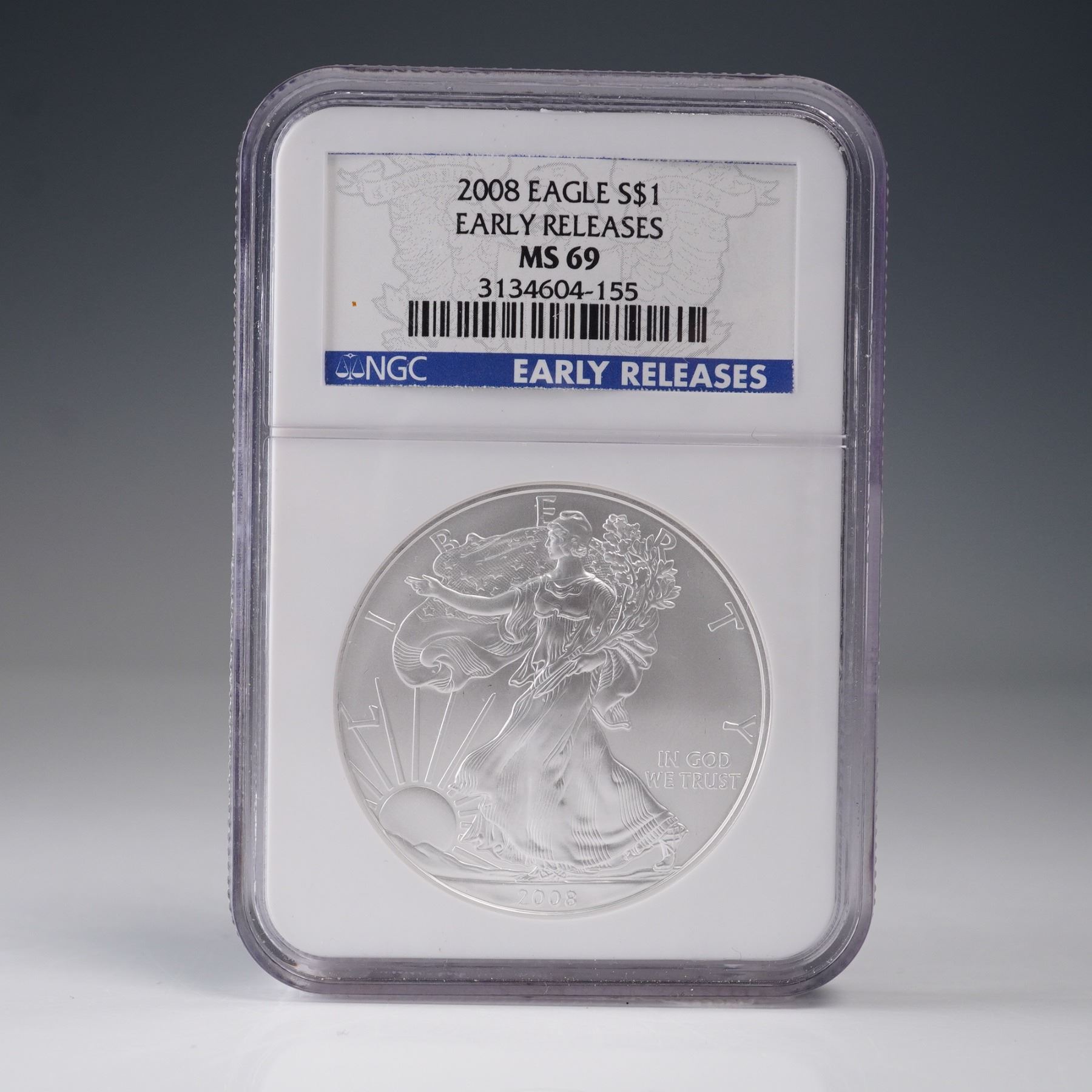 United States one dollar silver bullion coin minted in 2008, featuring the Walking Liberty design by Adolph A. Weinman on the obverse, originally used on the half dollar from 1916 to 1947. The reverse, designed by John Mercanti, displays a heraldic eagle with shield, thirteen stars, and the inscription "E PLURIBUS UNUM." Struck in one troy ounce of .999 fine silver, this Type 1 version retains the original reverse used from 1986 through mid-2021. The coin is certified and encapsulated by Numismatic Guaranty Corporation (NGC), designated as "Early Releases" and graded Mint State 69 (MS 69). Slab: 2.25"L x 0.5"W x 3.25"H. Coin diameter: 39mm.