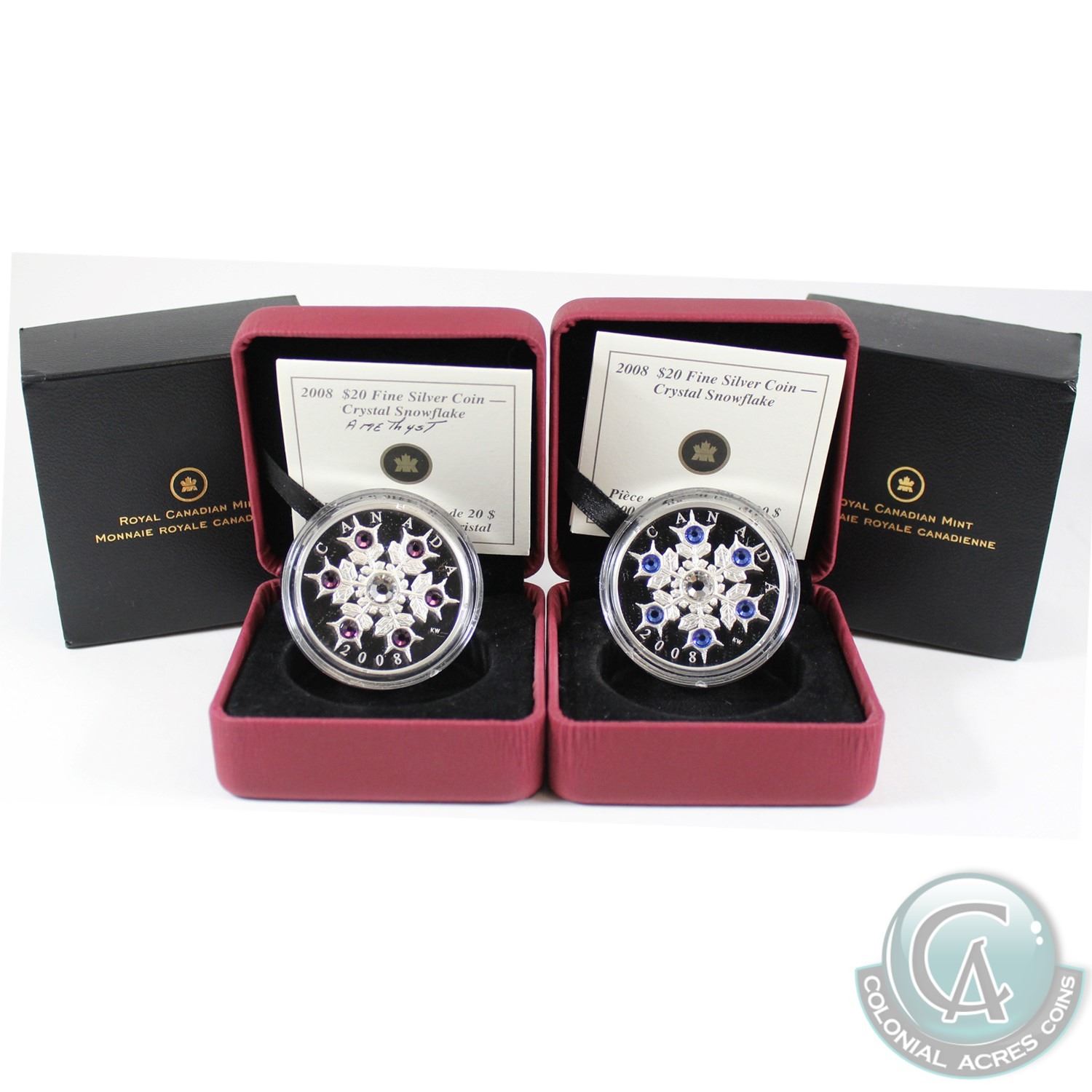 2008 Amethyst & Sapphire $20 Crystal Snowflake Fine Silver Coins (Tax Exempt). 2008 Amethyst has some writing on the COA and outer sleeve on both coin is tattered. 2pcs