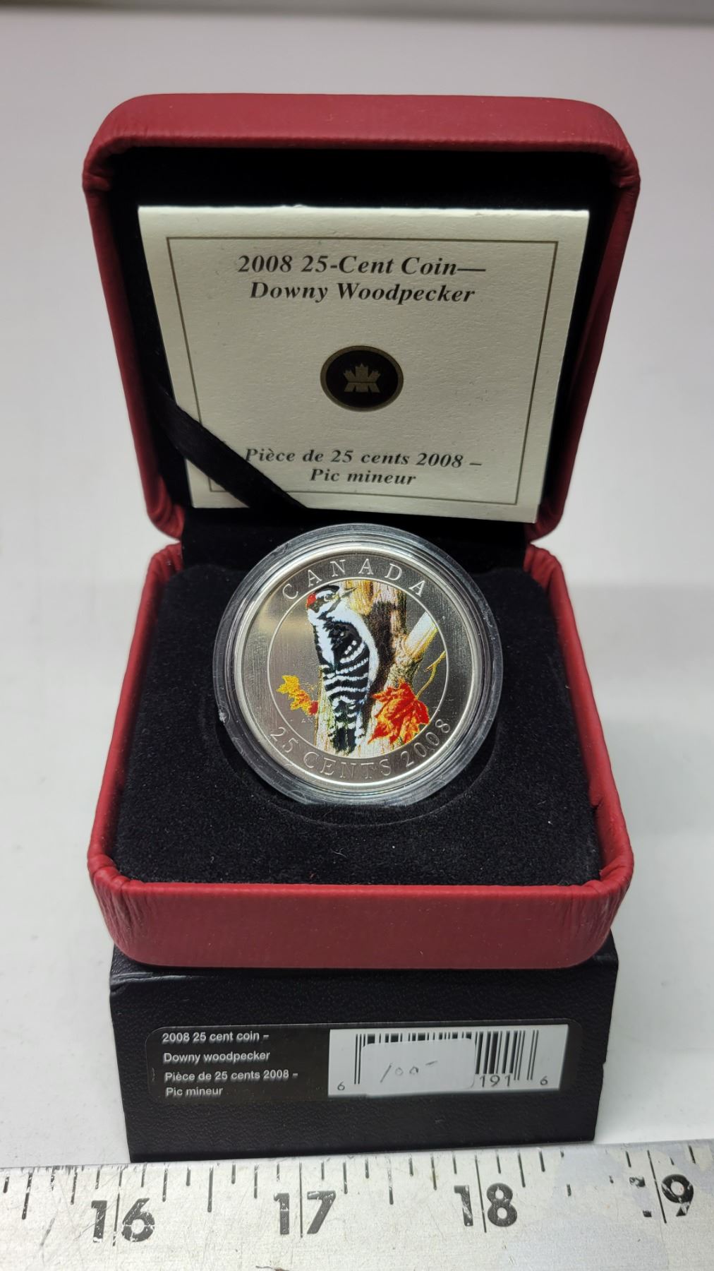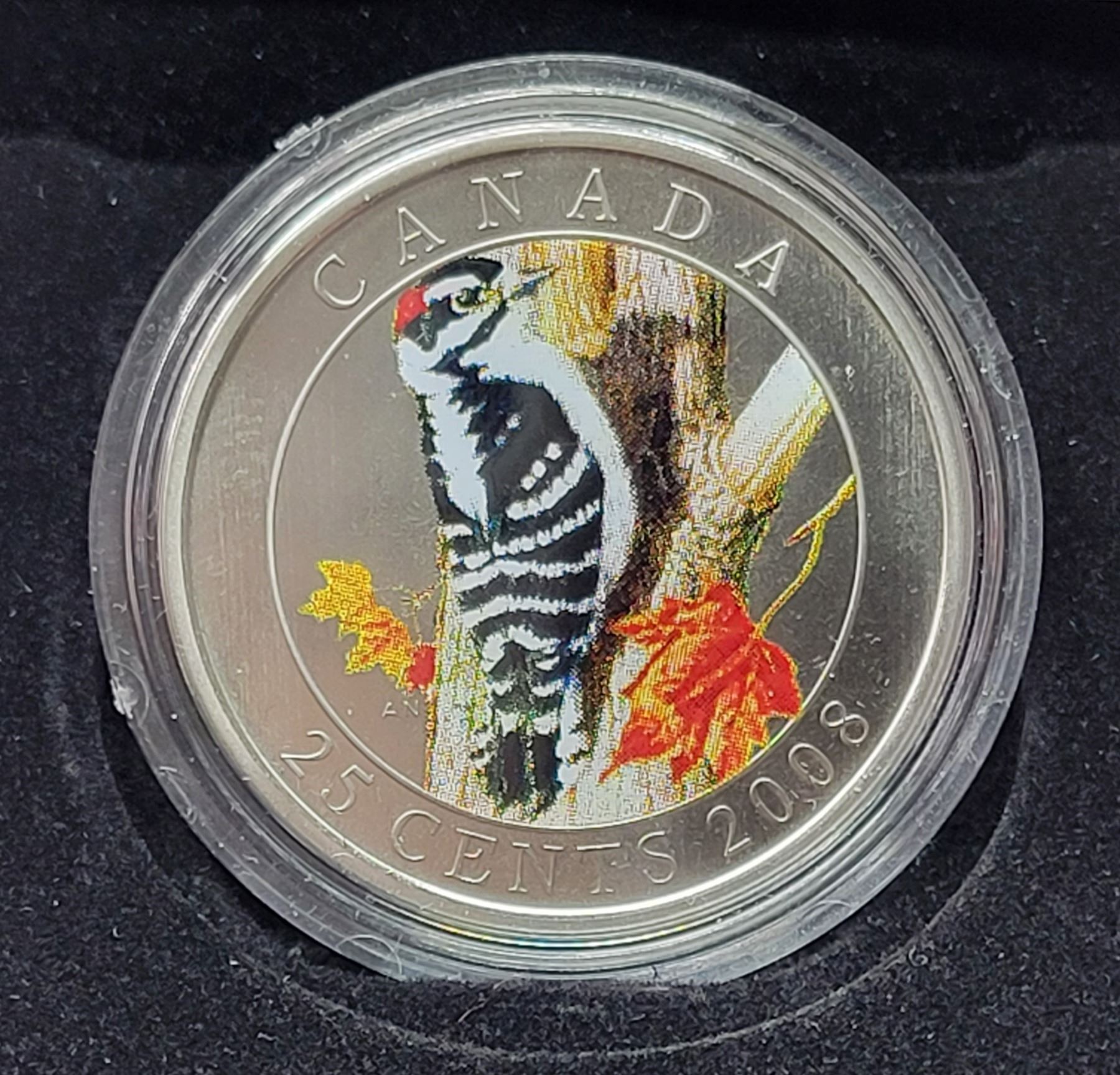 2008 Canada 25¢ Colored Coin, Downy Woodpecker, COA