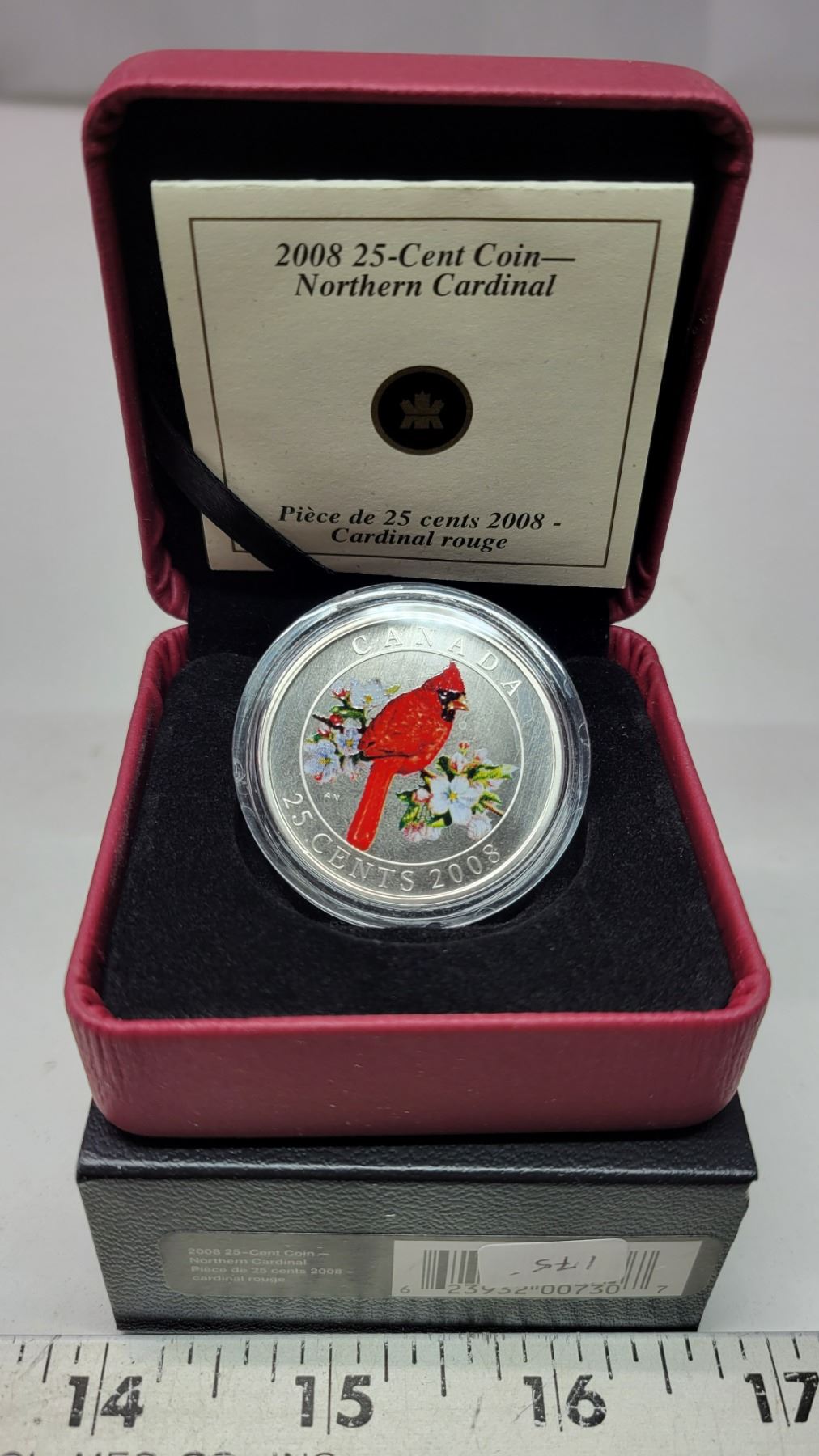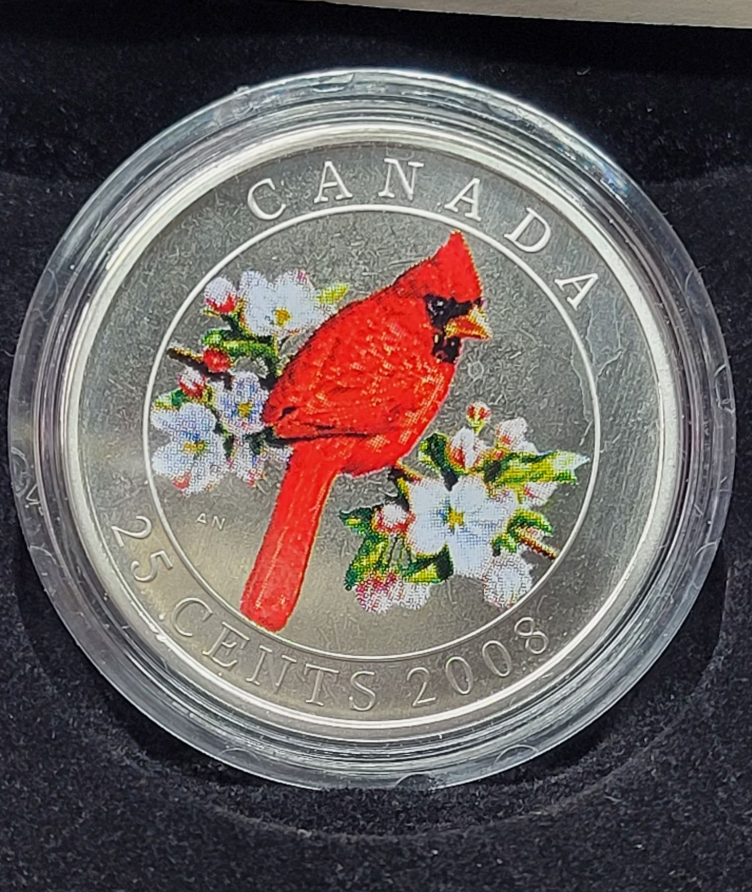 2008 Canada 25¢ Colored Coin, Northern Cardinal, COA