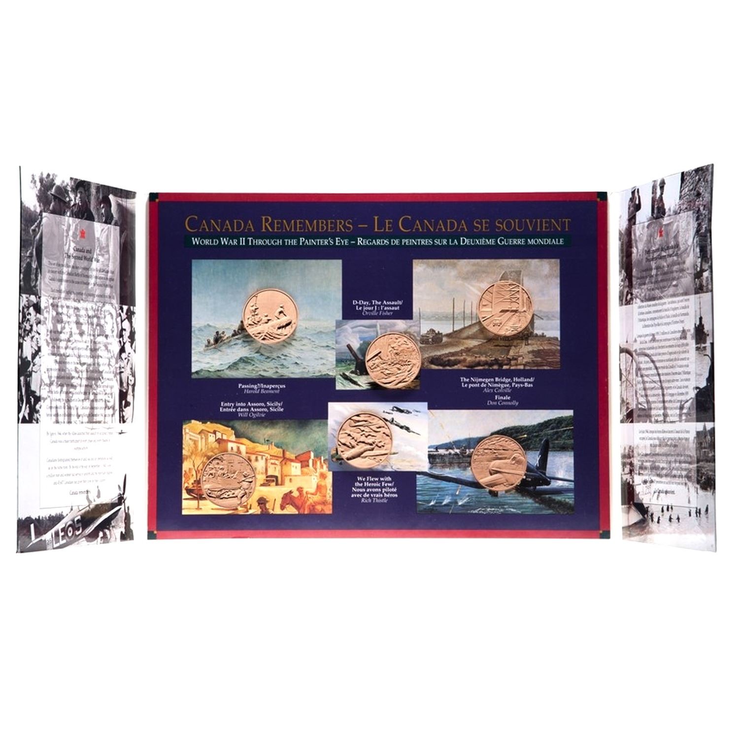 *2008 Canada Remembers WWII 6-piece Magnetic Medallion Set. Set Includes: Beament-Passing; Fisher-D-Day The Assault; Colville-The Nijmegen Bridge; Ogilvie-Entry into Assoro; Thistle-We Flew with the Heroic Few; Connolly-Finale.