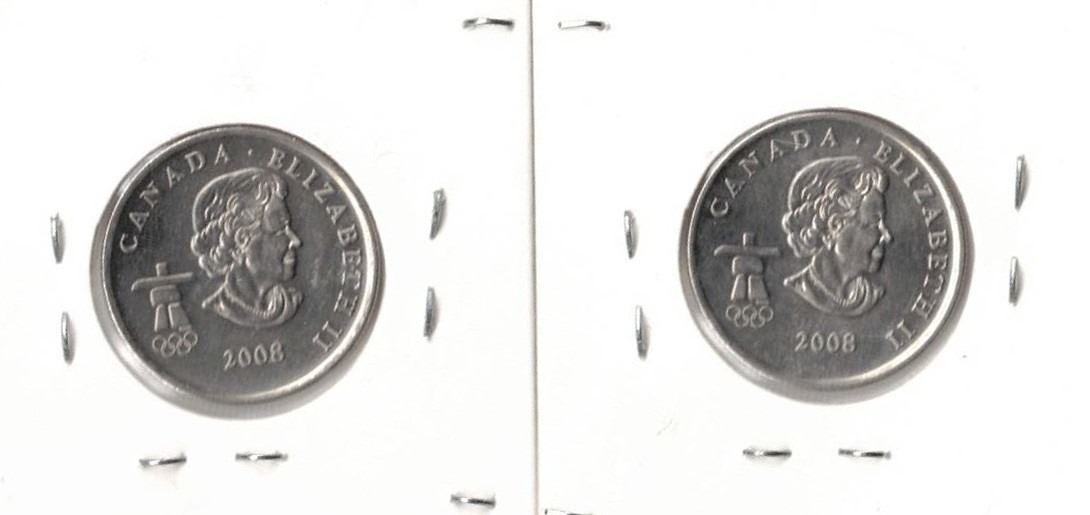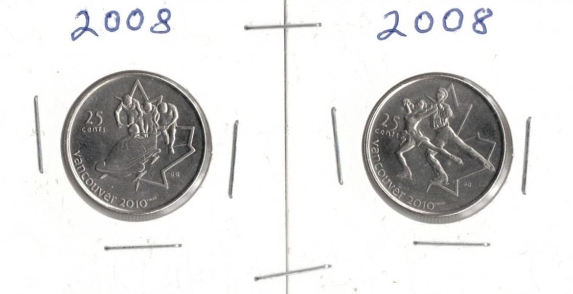 Two different 2008 Canadian 25-cent Olympic coins, part of a series issued by the Royal Canadian Mint in the lead-up to the Vancouver 2010 Winter Olympic Games.