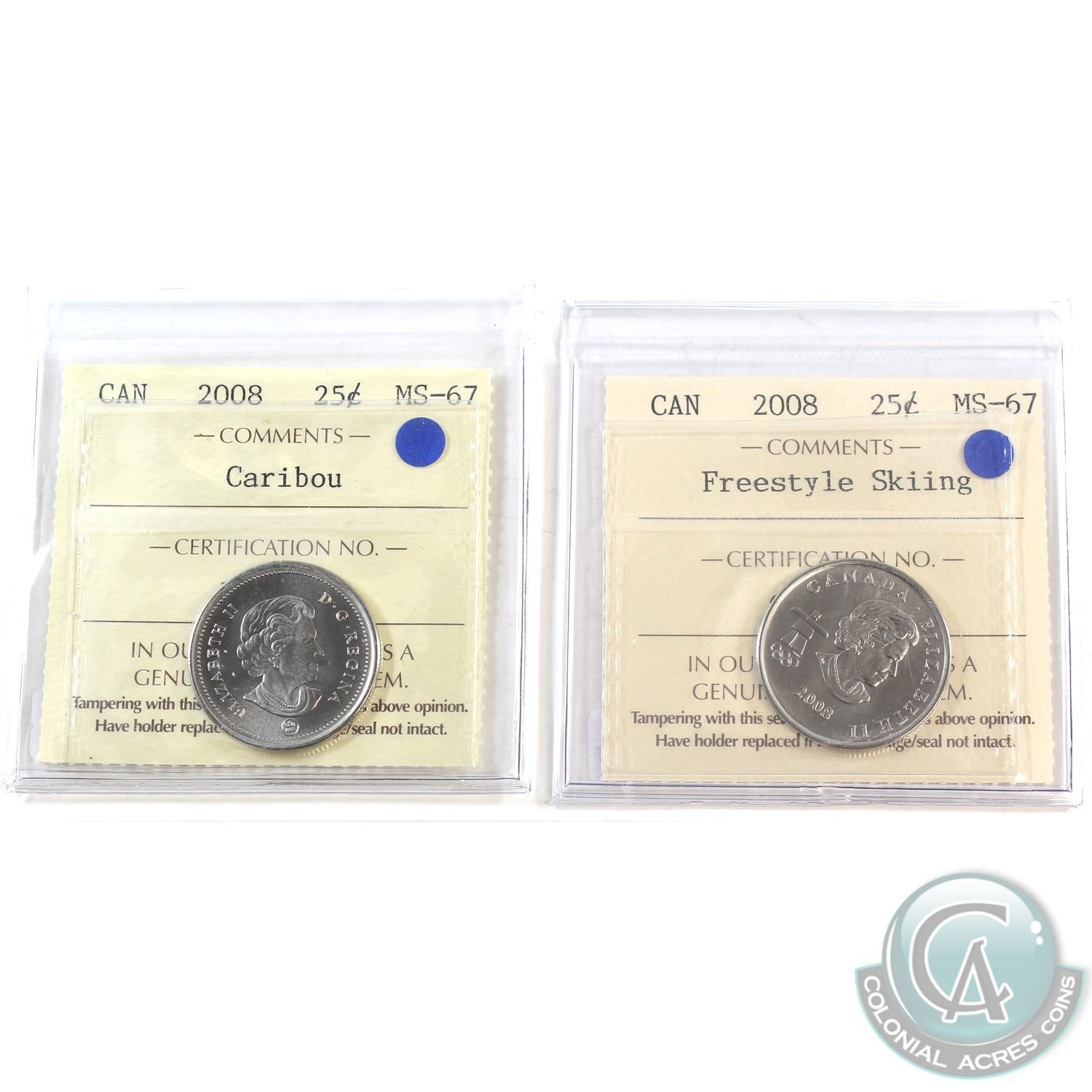 2008 Caribou & 2008 freestyle Skiing 25-cent ICCS Certified MS-67. 2pcs