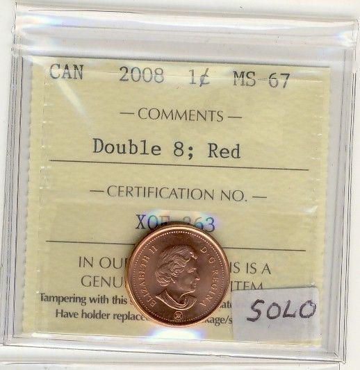 2008 Cents, ICCS MS67; Red, Double 8. Solo highest graded.