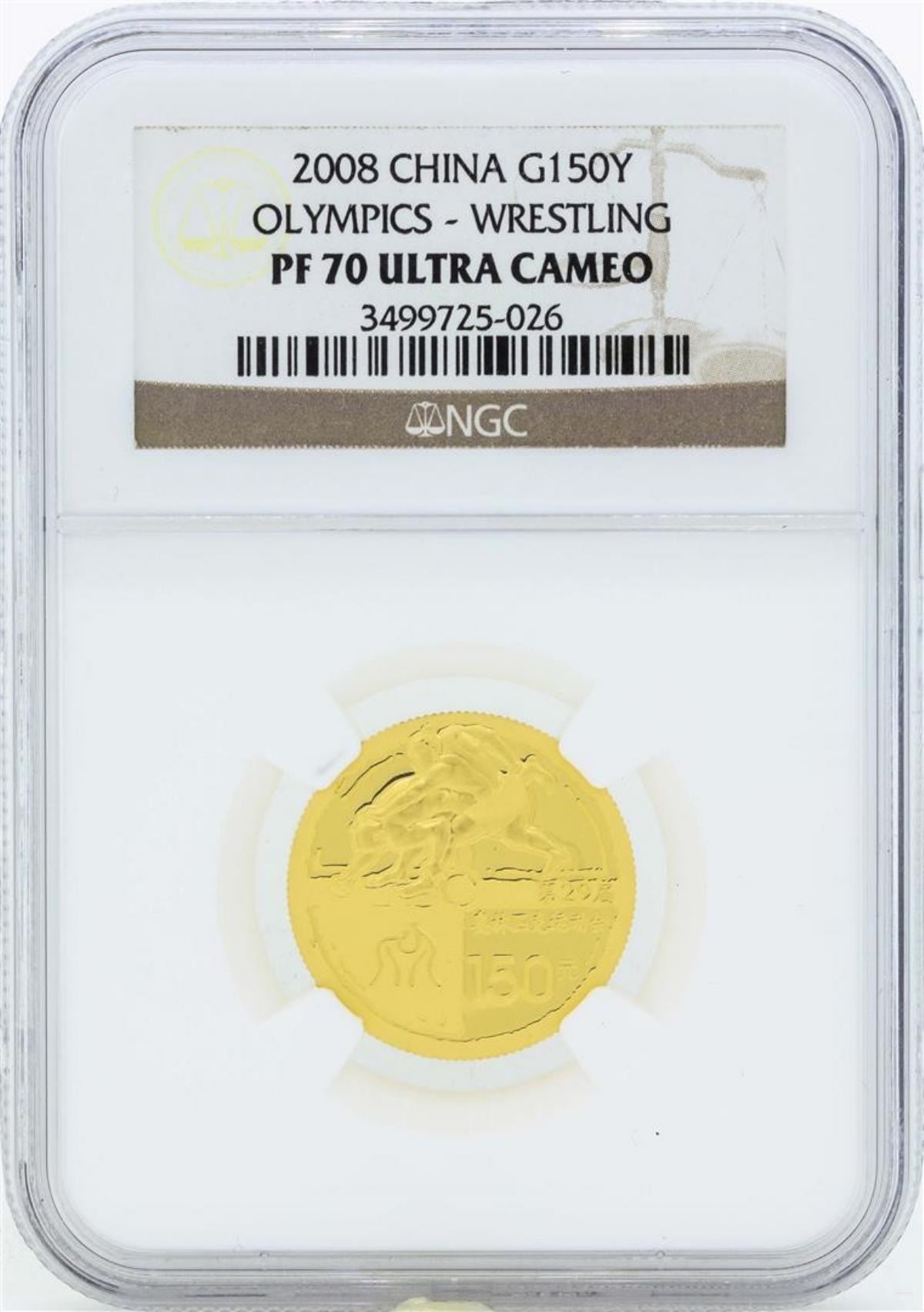 One 2008 China 150 Yuan Olympics Wrestling Gold Coin NGC PF70 Ultra Cameo. NGC Certified.