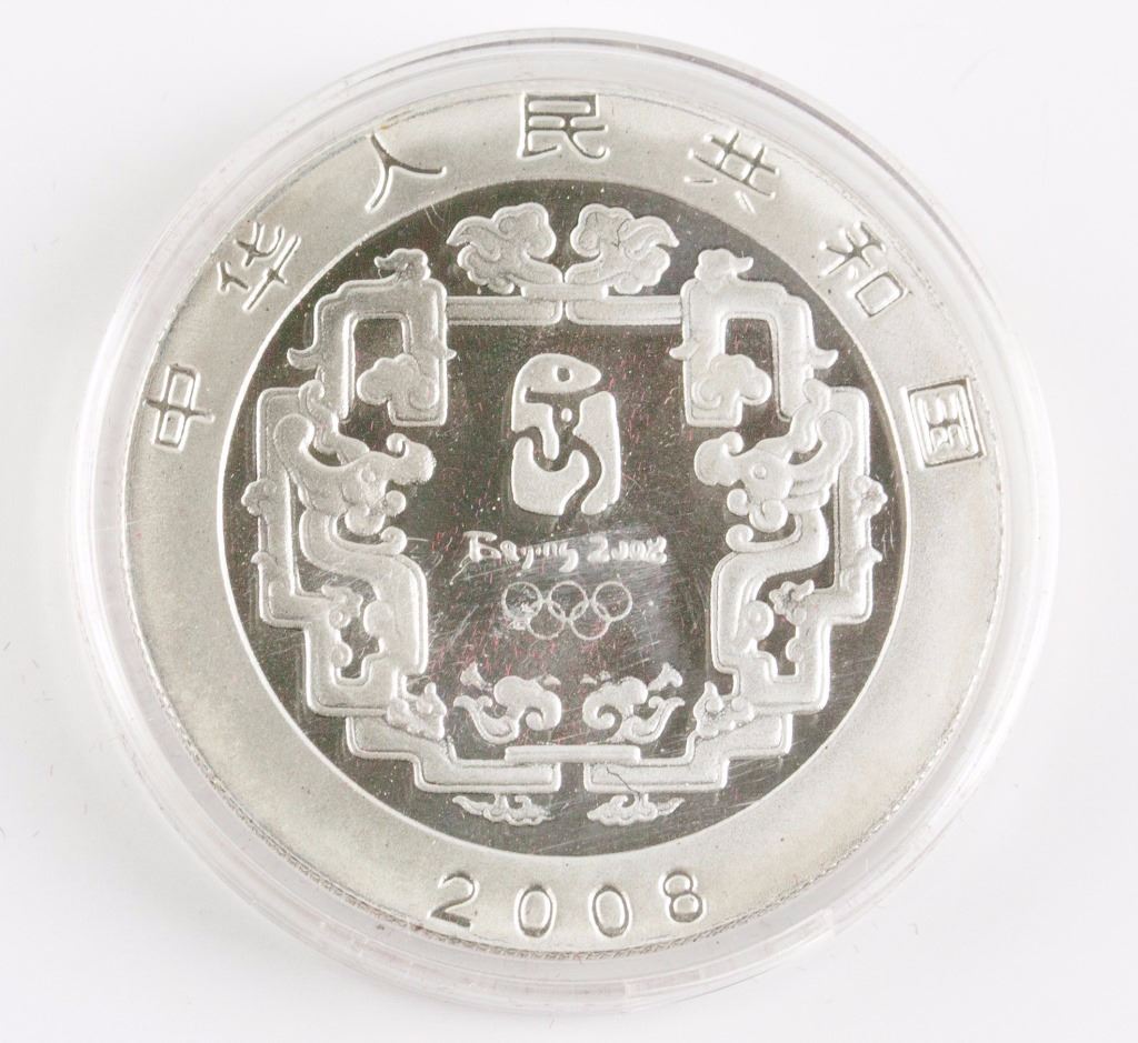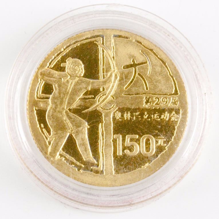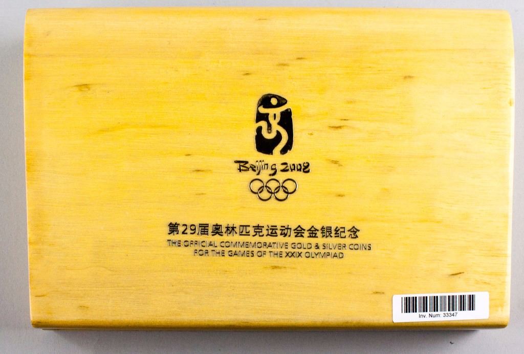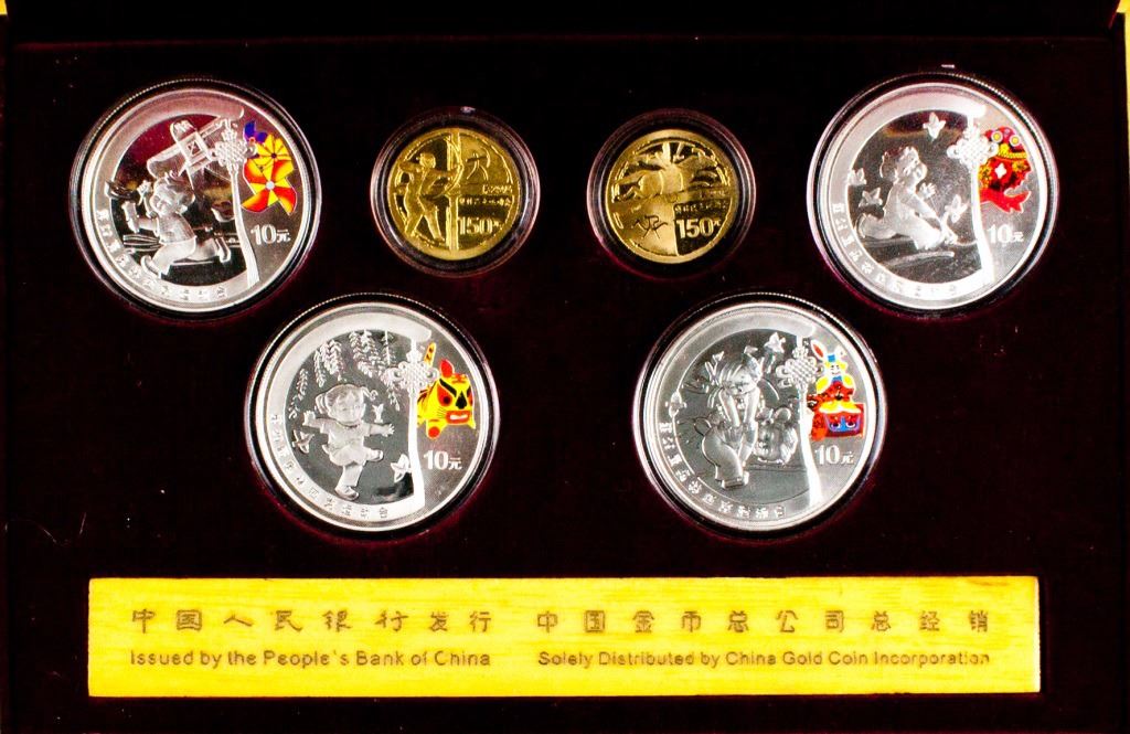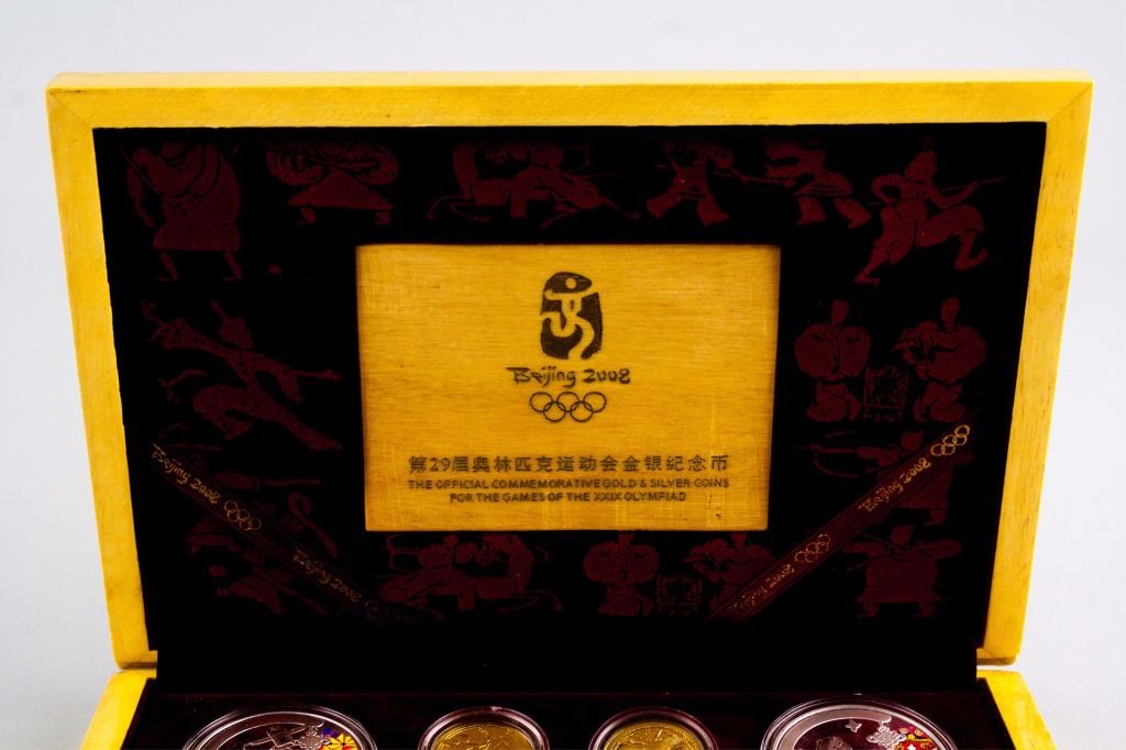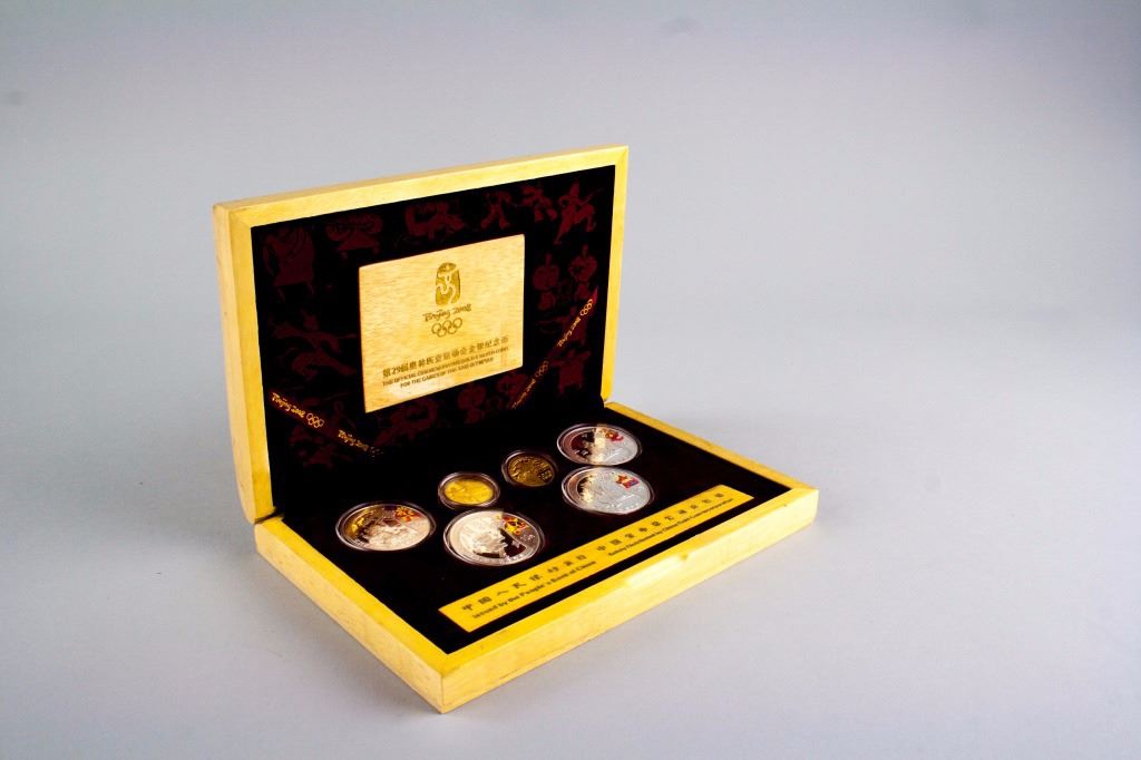 2008 China 29th Olympics Games commemorative six (6) coin set; obverse engraved children playing tradition games, lettering" Di 29 Jie Ao Lin Pi Ke Yun Dong Hui, 10 Yuan, 150 Yuan"; reverse engraved five ring, dragon totem and Beijing Olympic symbol, lettering "Zhong Hua Ren Min Gong He Guo, 2008"; with box; 15 cm x 22 cm, 500 grams